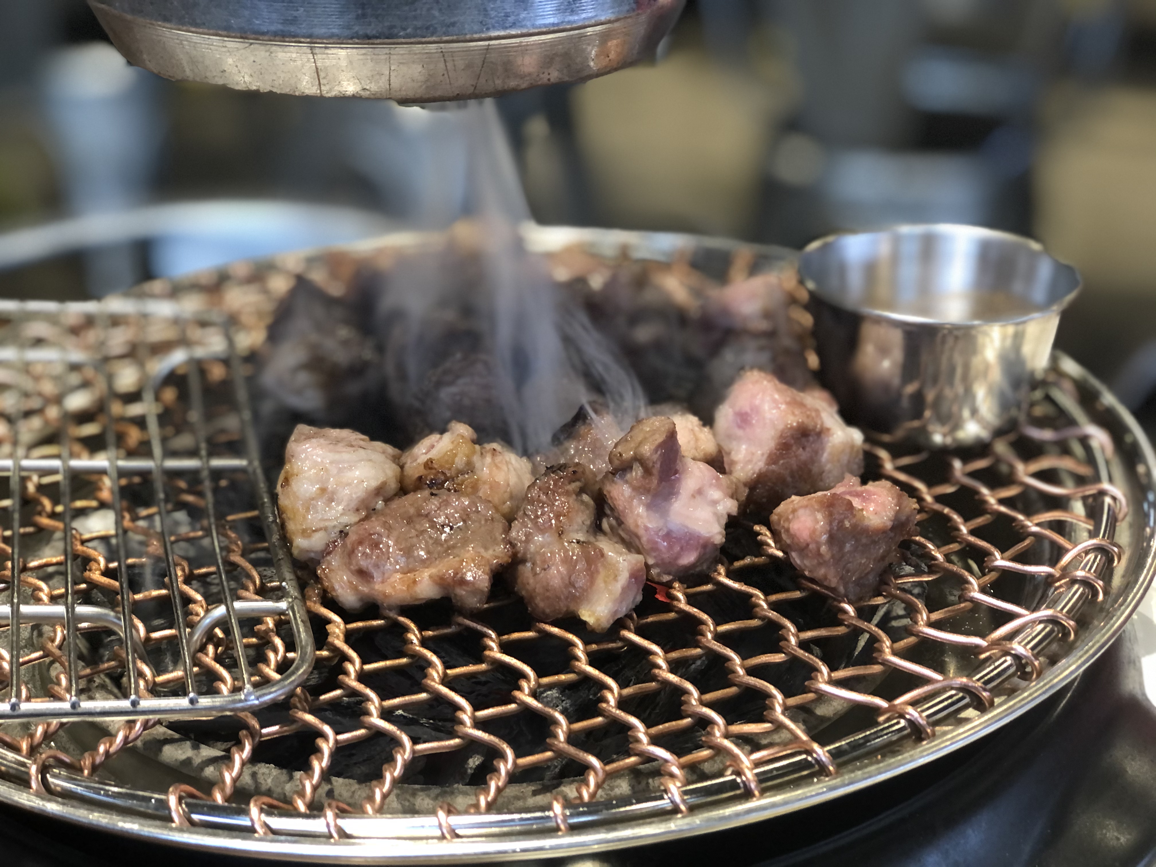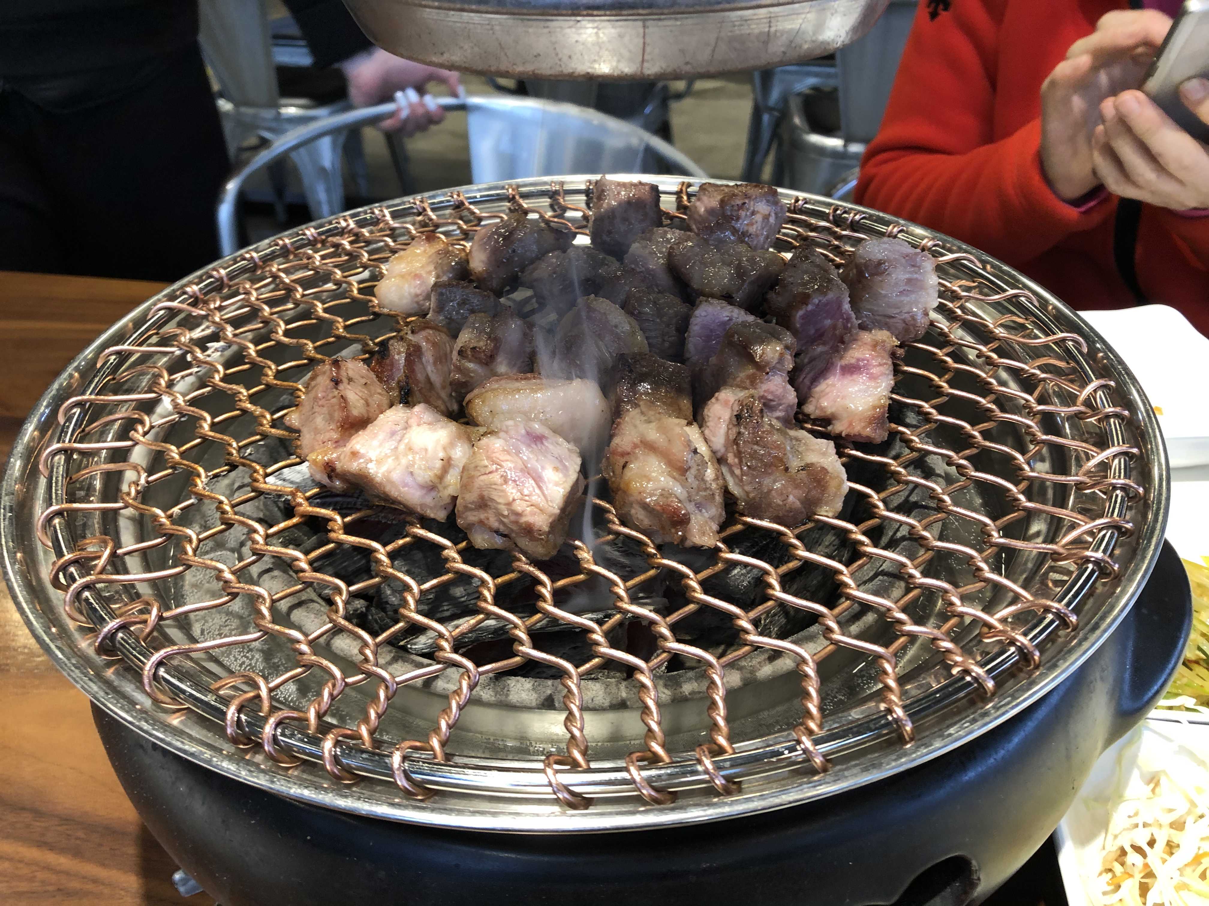 목살이었는데요, 처음에 생고기를 가져와주셔서 보여주시면서 초벌을 따로 해서 가지고오십니다. 초벌도 하고 조각도 내서 올려주세요. 반 정도는 구워주시고 목살은 굽기에 따라서 개인취향이 있으니 알아서 나머지 구워드시라고 하셔용. 그래도 고기를 좀 태울것같거나 너무 많이 굽는 것 같으면 스르륵 오셔서 케어해주신답니다.