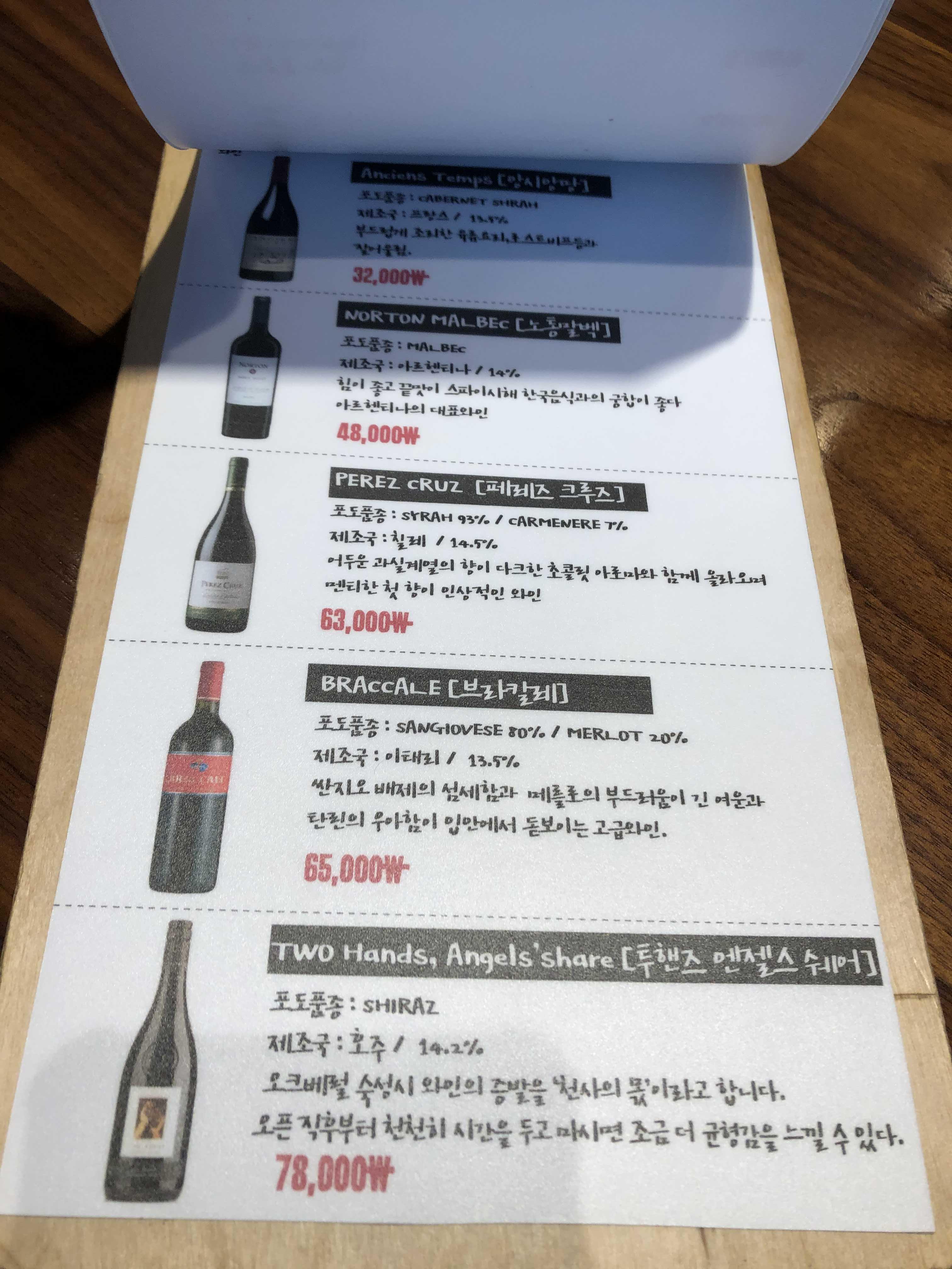 와인도 취급하고 계시더라구요! 제가 맛있게 마셨었던 투핸즈 엔젤스쉐어도 보이네요! 가격은.. 와인샵에서 구매하는 것 보다는 2배 비싸구요! 🤣 식당에서 판매하는 와인은 다 저정도 하는 것 같았어요. 콜키지도 있는데, 콜키지는 1만원이네요.