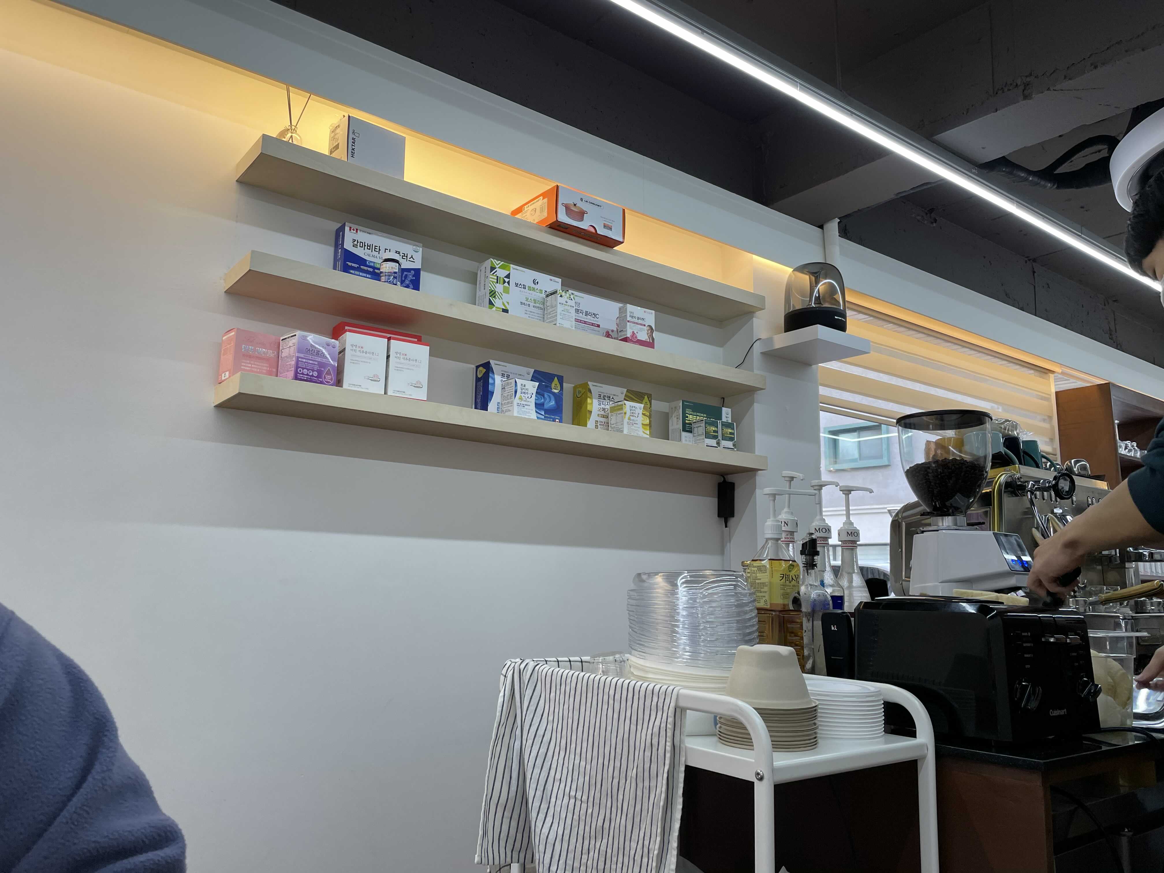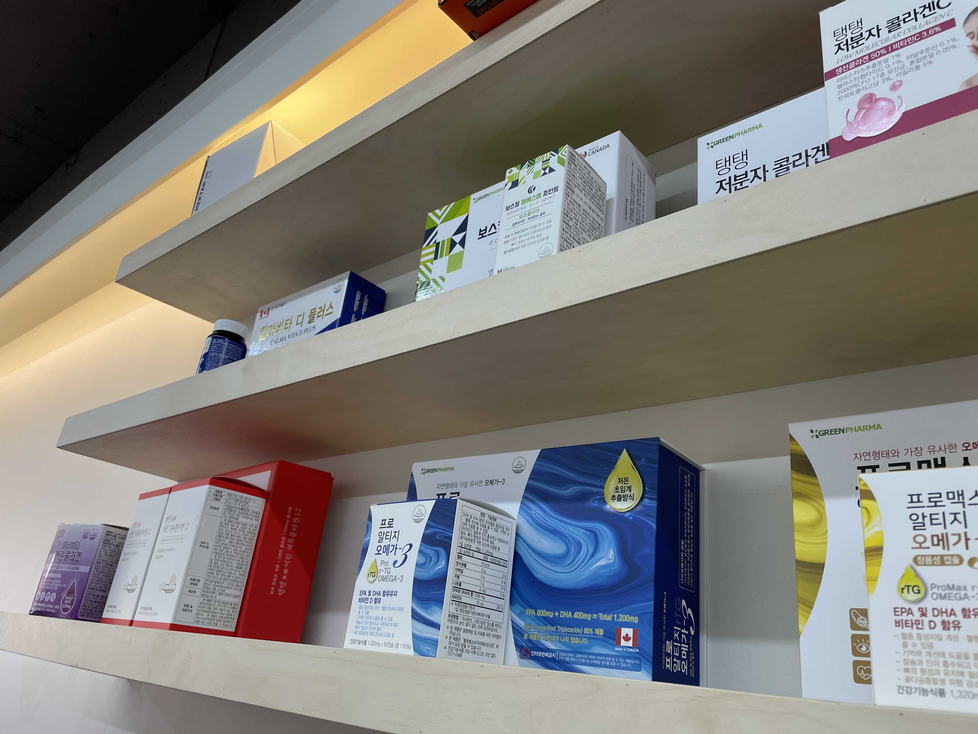 보는 것 처럼 선반 위에 선강기능식품들이 많이 있어요. 다 판매하시는 제품들 인 것 같아요. 반대쪽으로 가면 더 다양한 상품들이 많이 있어서 찬찬히 보면서 사진도 찍어보고 싶었는데, 손님들이 계셔서 그러진 못했네요 😂