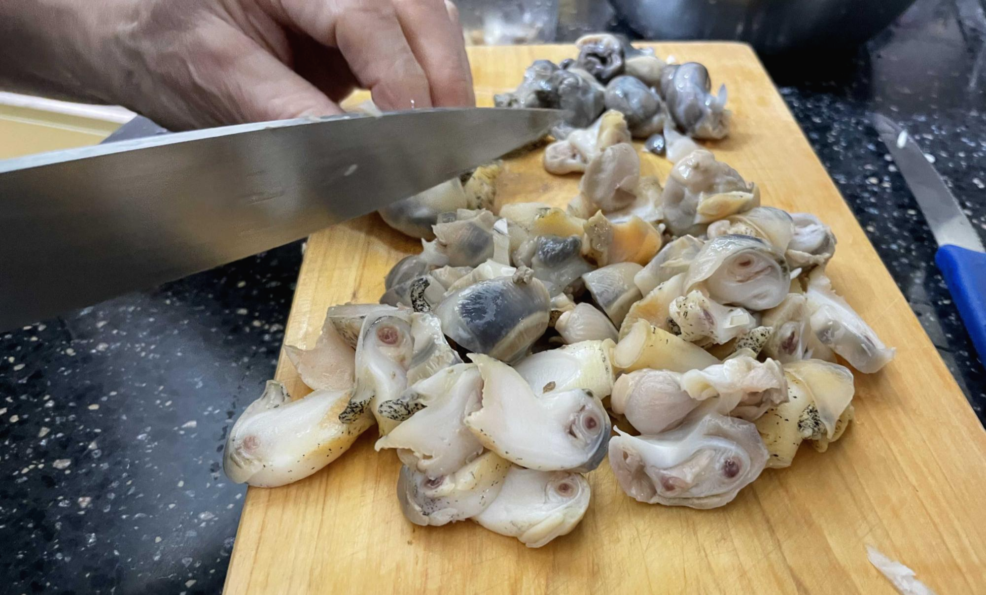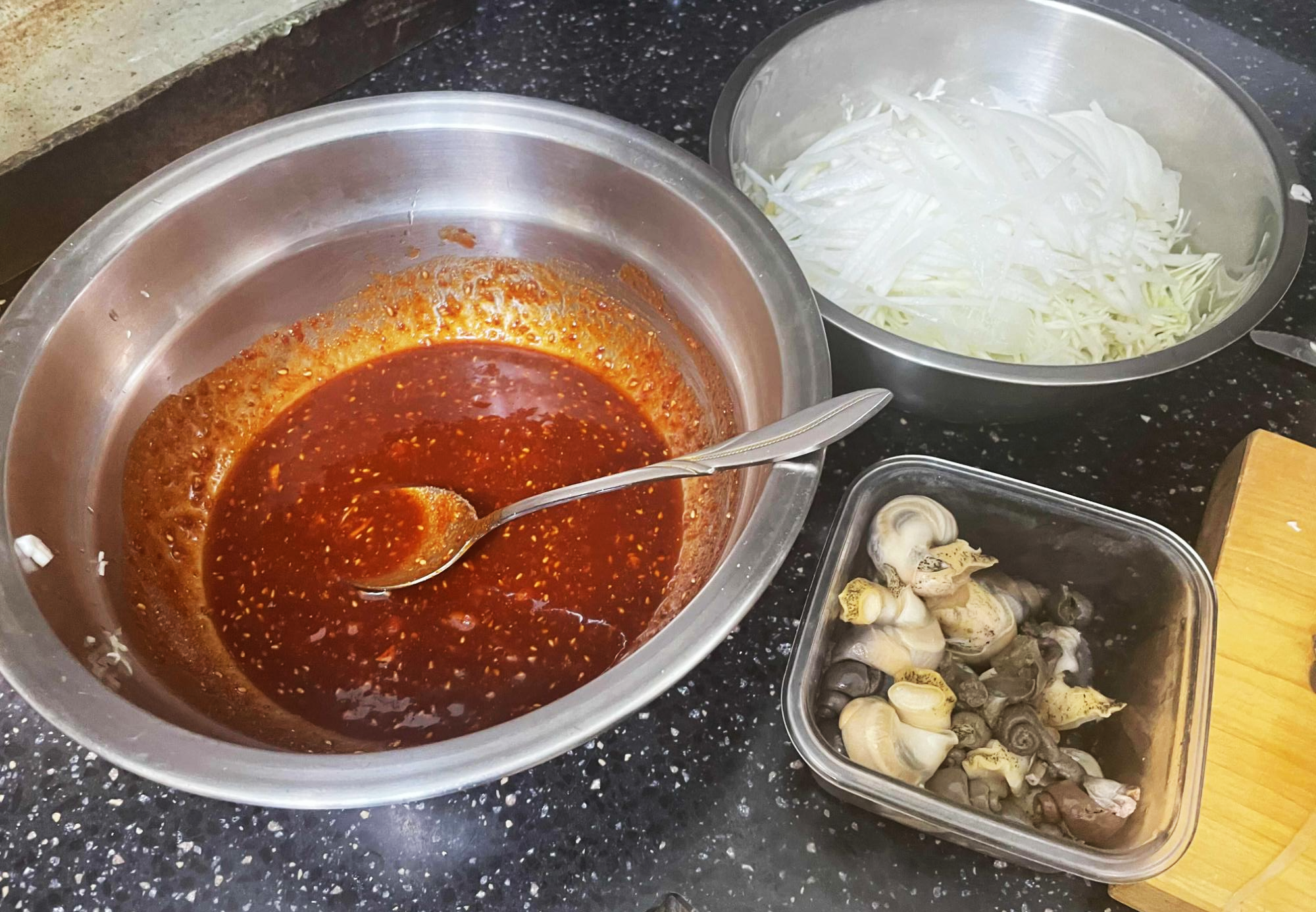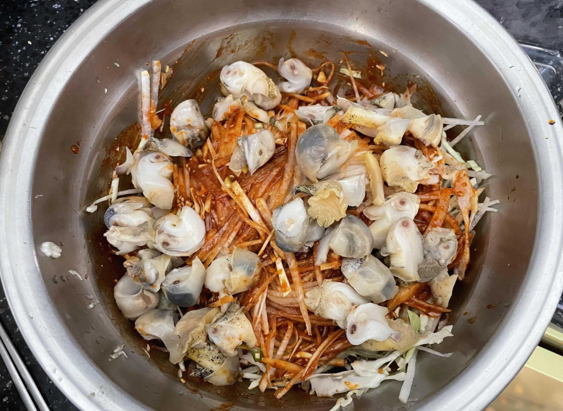 그리고, 썰어둔 골뱅이를 투척! 내장부분은 따로 모아두었는데, 비비적 거리면 모두 망그라지니 마지막에 넣을 거에요! 골뱅이의 양이 엄청나게 많네요.