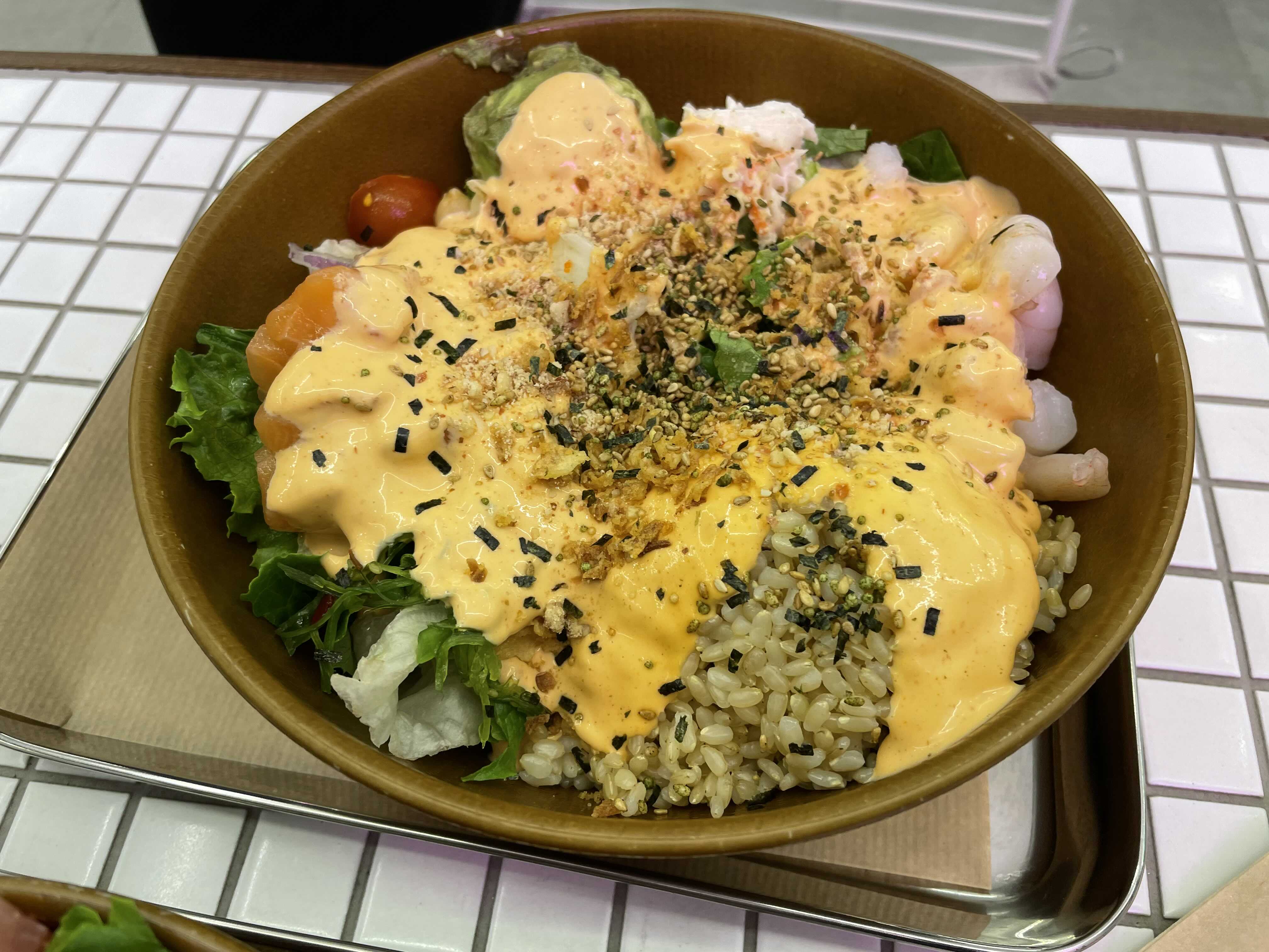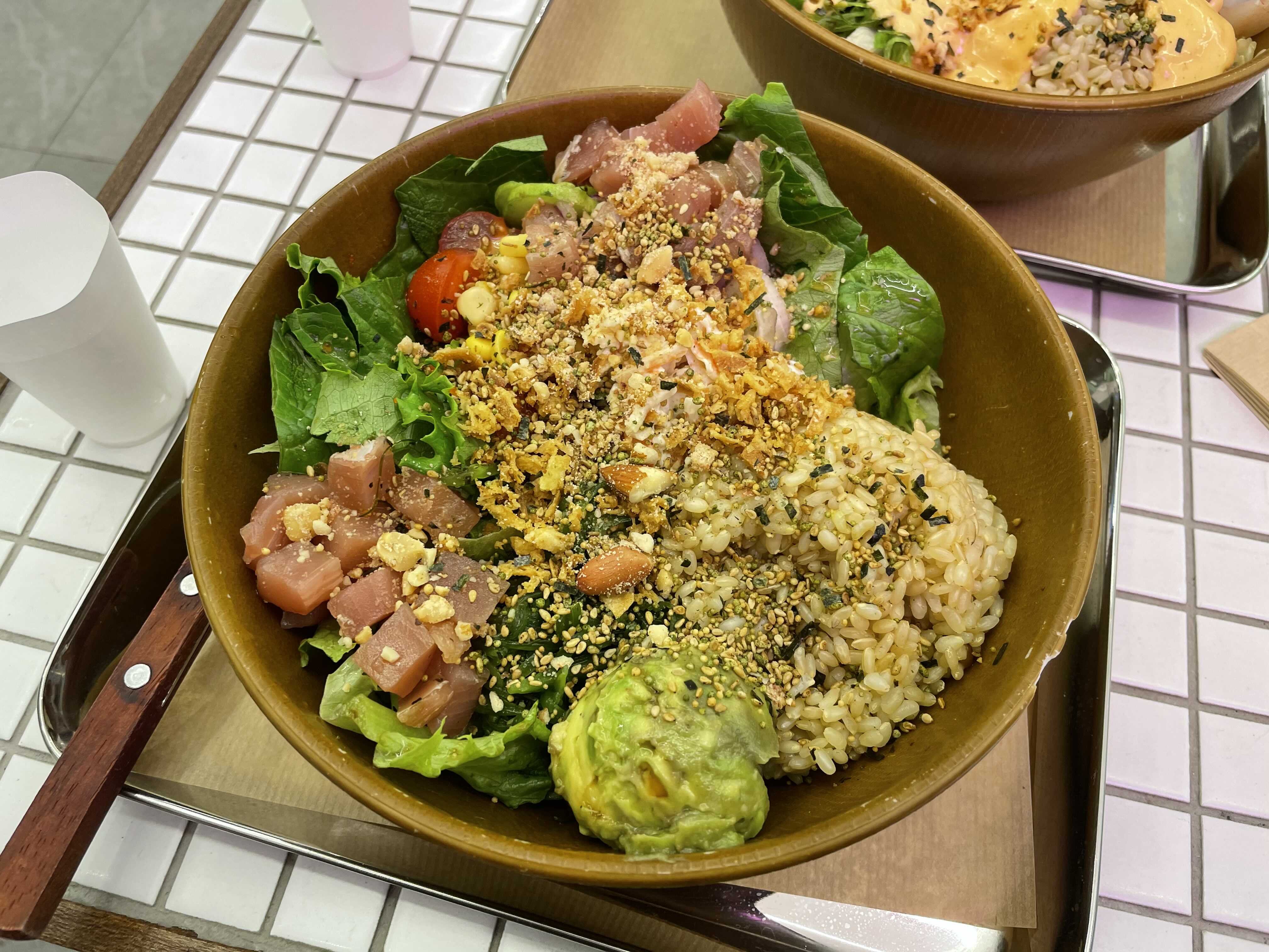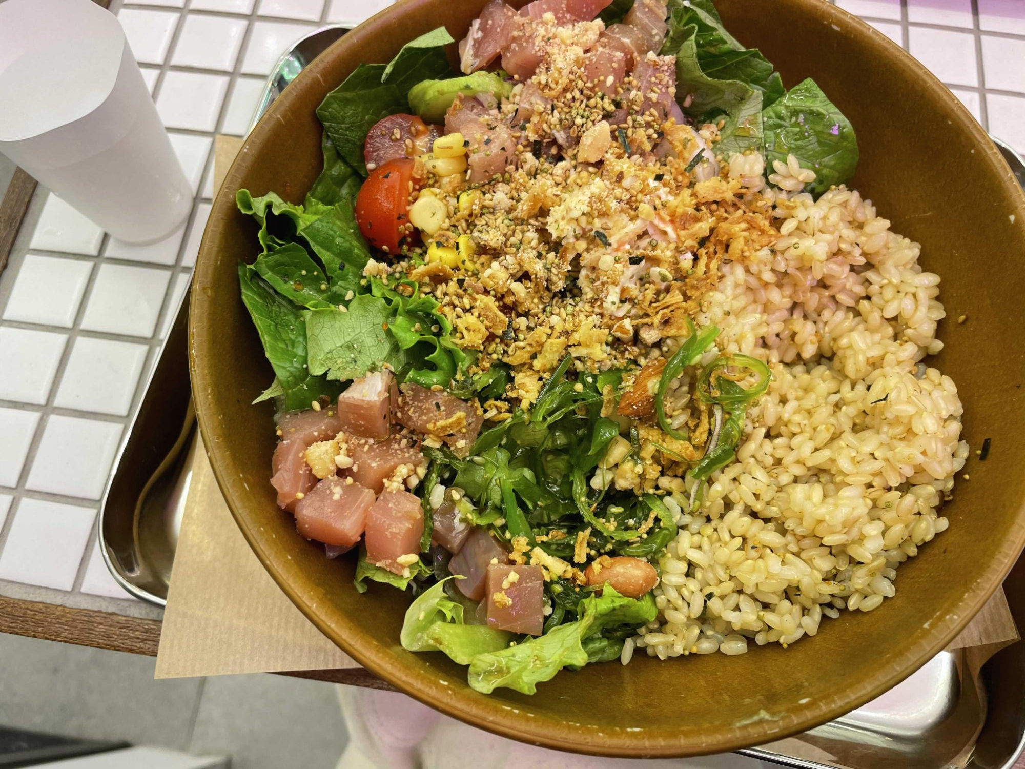 제가 주문한 매뉴는 하와이클레식! 연어가 들어가있는 샐러드이구 현미밥 베이스에요. 안에 구성을 살펴보면 미역줄기도 있고, 병아리콩 등등 다 들어가있어요. 현미밥 베이스라고 해서 저는 우리가 평소에 먹는 현미밥인줄 알았는데, 아니더라구요. 생쌀 불려놓은 느낌..? 너무 딱딱하고 텁텁하고 이 부분은 저는 좀 실망했어영.. 의도가 있었겠다만. 메인 옵션인 현미밥의 경우는 이런식으로 다 생쌀불린 느낌의 현미밥인 것 같았어요! ㅠ.ㅠ 흡... 난 이건 정말 별루다 잉.. 차라리 찐밥이 좋아요.
