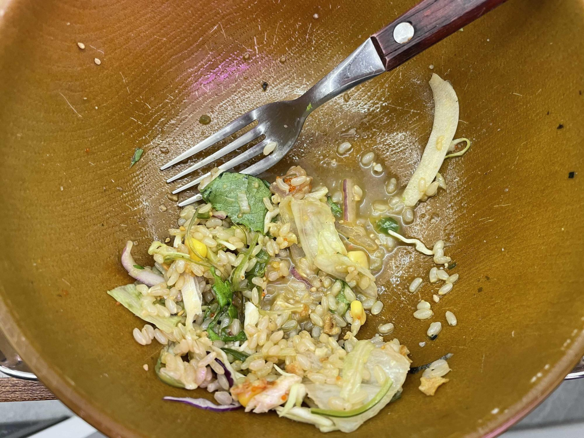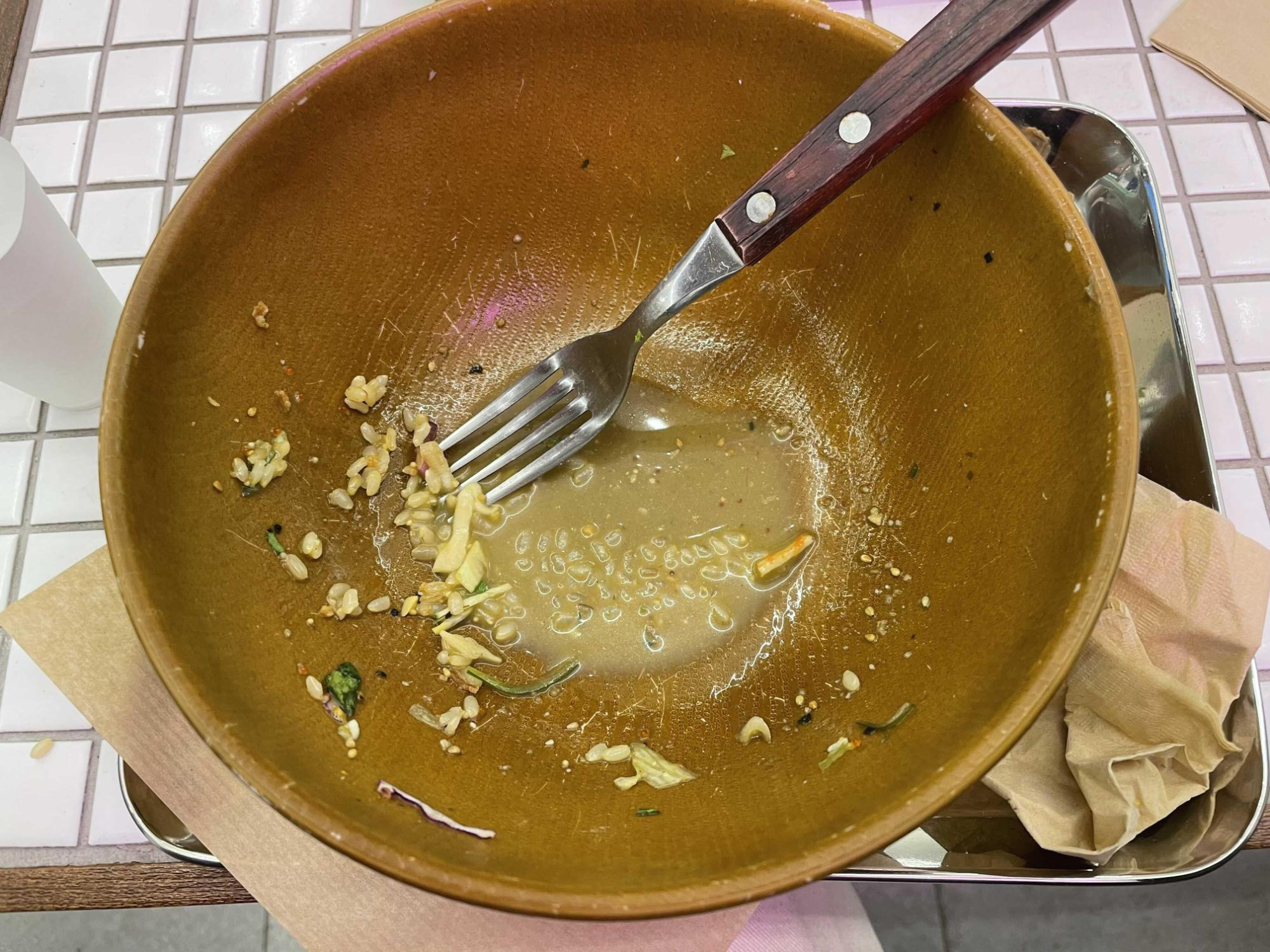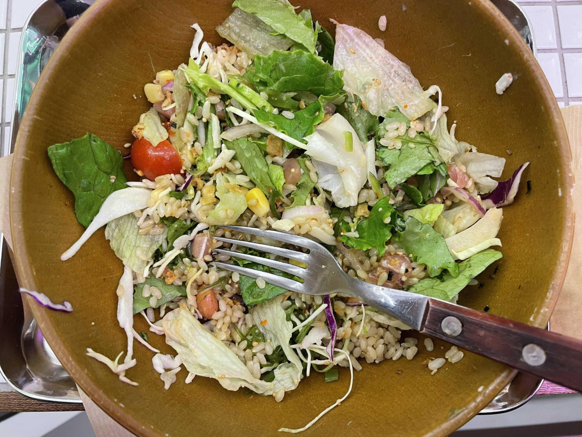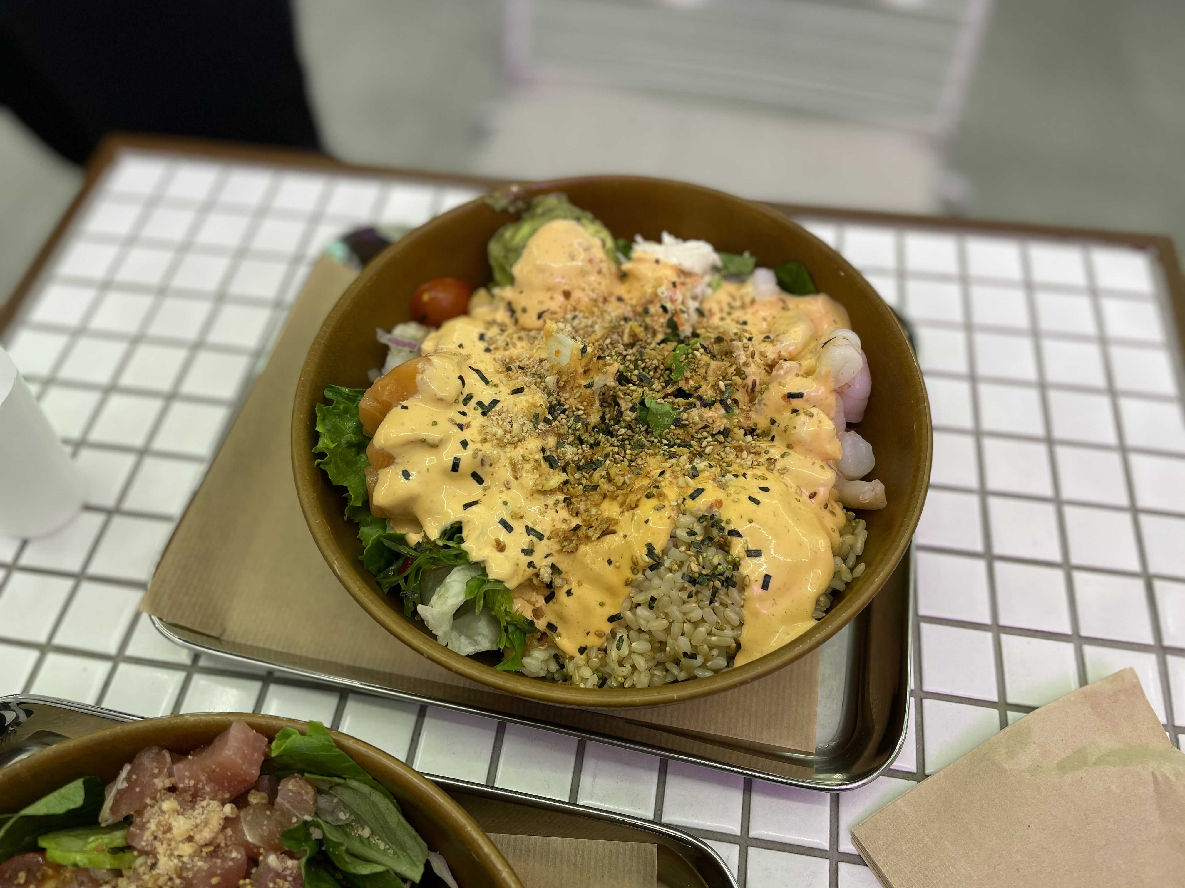 제가 주문한 매뉴는 하와이클레식! 연어가 들어가있는 샐러드이구 현미밥 베이스에요. 안에 구성을 살펴보면 미역줄기도 있고, 병아리콩 등등 다 들어가있어요. 현미밥 베이스라고 해서 저는 우리가 평소에 먹는 현미밥인줄 알았는데, 아니더라구요. 생쌀 불려놓은 느낌..? 너무 딱딱하고 텁텁하고 이 부분은 저는 좀 실망했어영.. 의도가 있었겠다만. 메인 옵션인 현미밥의 경우는 이런식으로 다 생쌀불린 느낌의 현미밥인 것 같았어요! ㅠ.ㅠ 흡... 난 이건 정말 별루다 잉.. 차라리 찐밥이 좋아요.