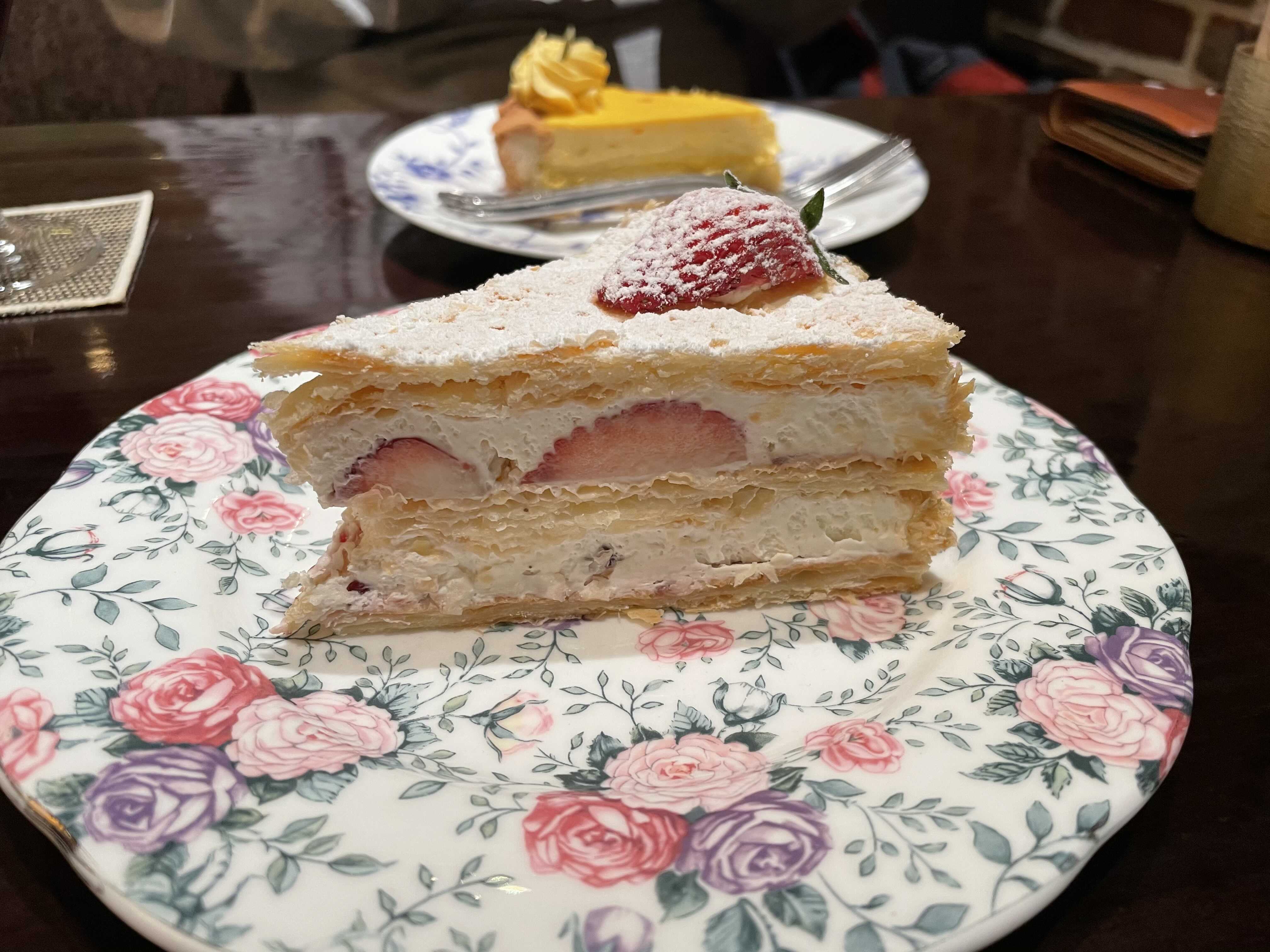중간에 층층이 들어간 파이가 너무 뻑뻑하지도 눅눅하지도 않고 진짜 아주 딱! ㅎㅎㅎㅎ 여기 케익은 전체적으로 인위적인 단맛이 아니라 좋았어요! 설탕 막 때려넣은 맛도 너무 좋지만 요런 슴슴한 달달한 맛도 좋아요 ㅋㅋㅋㅋㅋ