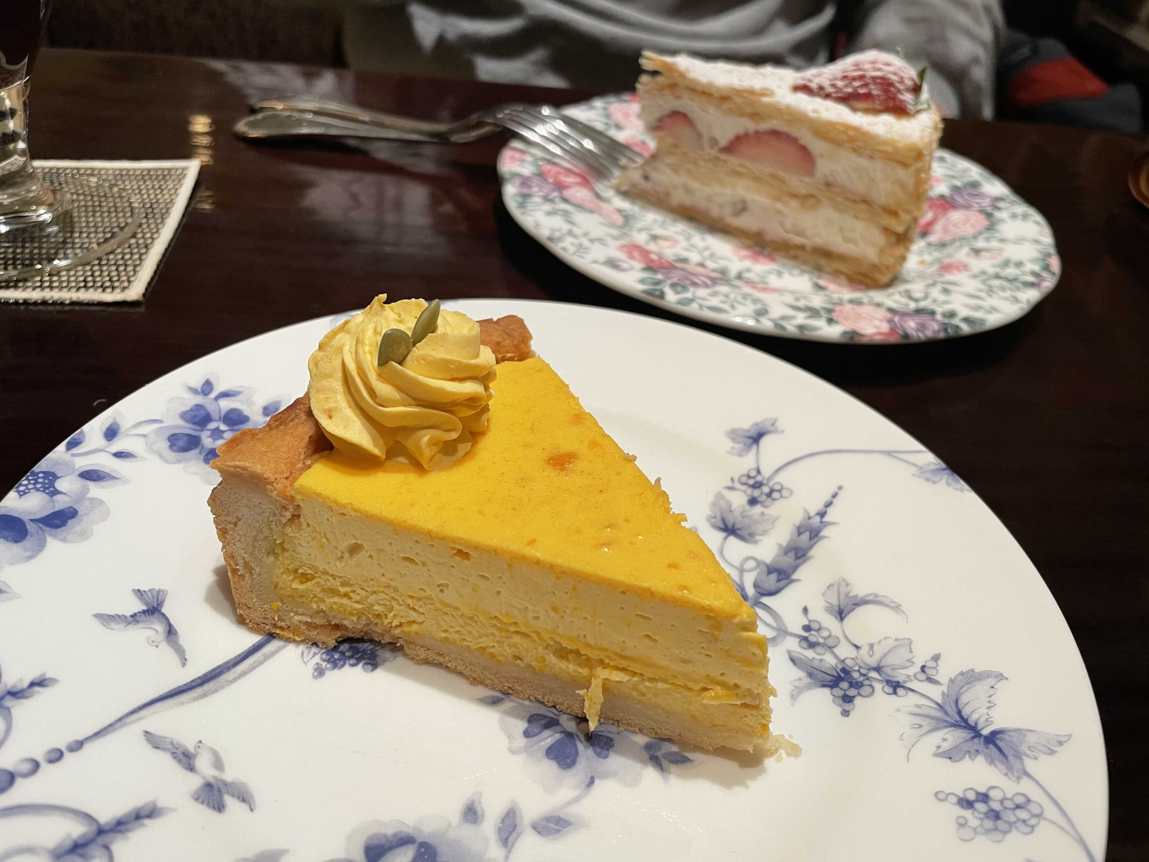 케익은 거의 7천 - 8천 정도선이었는데 카페라리에서 직접 만드는 케익이라 그런지 뭔가 정성스럽고 맛있어 보였어여! 우리는 하나는 가장 인기있다고 하는 딸기 밀푀유, 그리고 호박 타르트, 아이스아메리카노 2잔을 주문했어요.