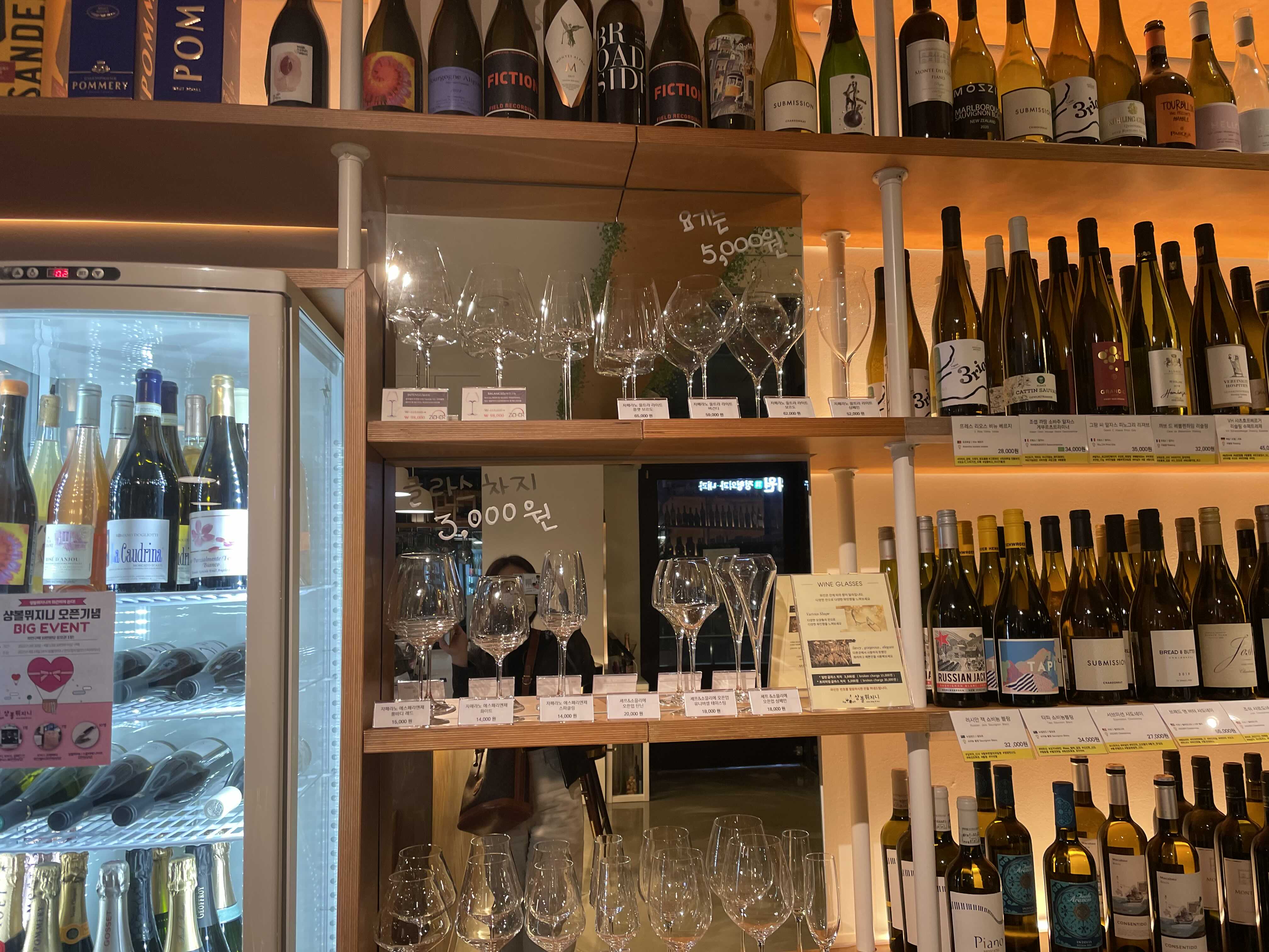 화이트와인잔 레드와인잔 샴페인잔 등등 종류별로 있고, 비싼 브랜드의 잔은 5,000원, 아닌 잔들은 3,000원이에요.