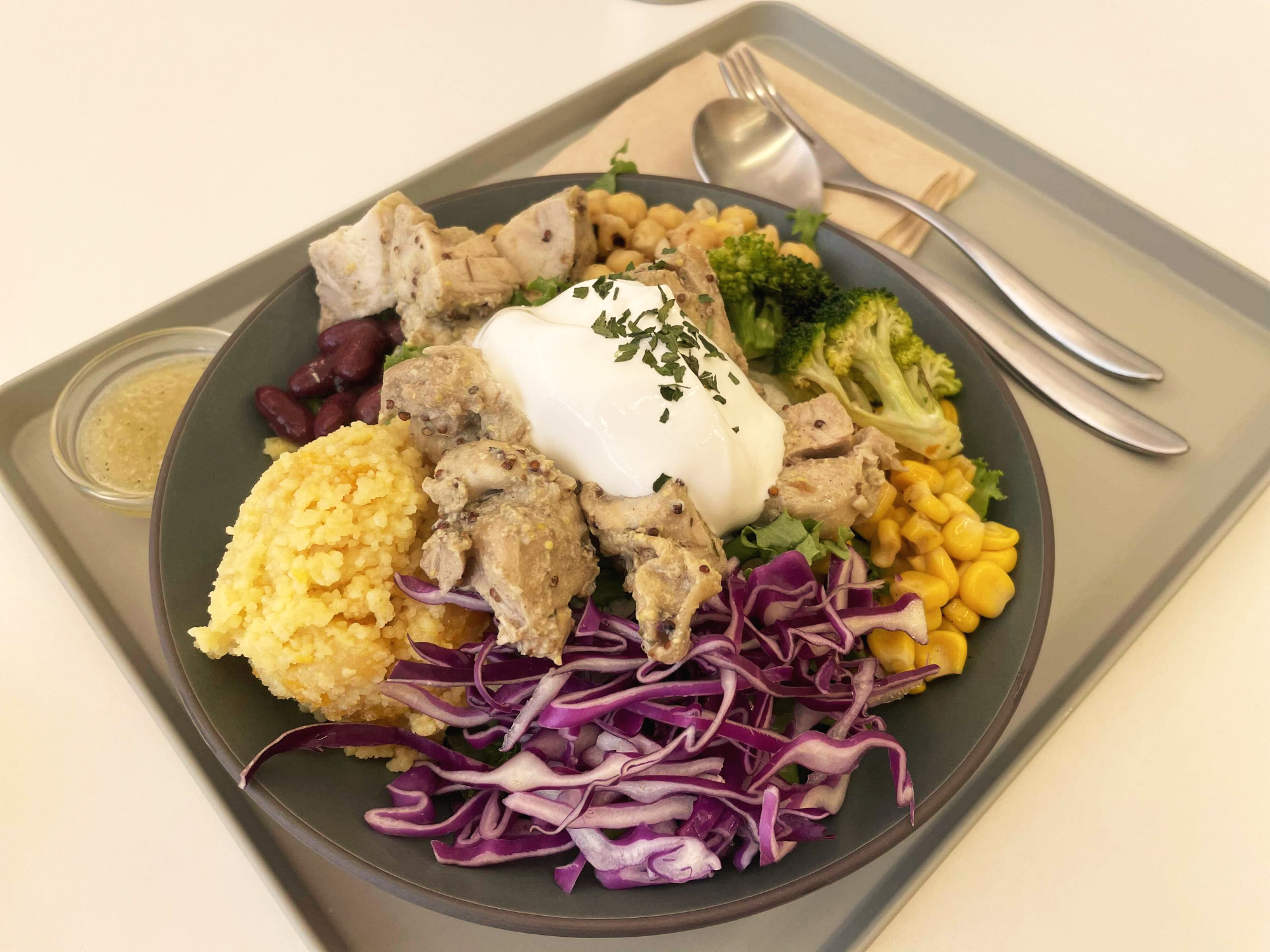 조미된 닭다리살 치킨 위에 그릭 사워크림이 듬뿍 올라가있는 메뉴입니다.