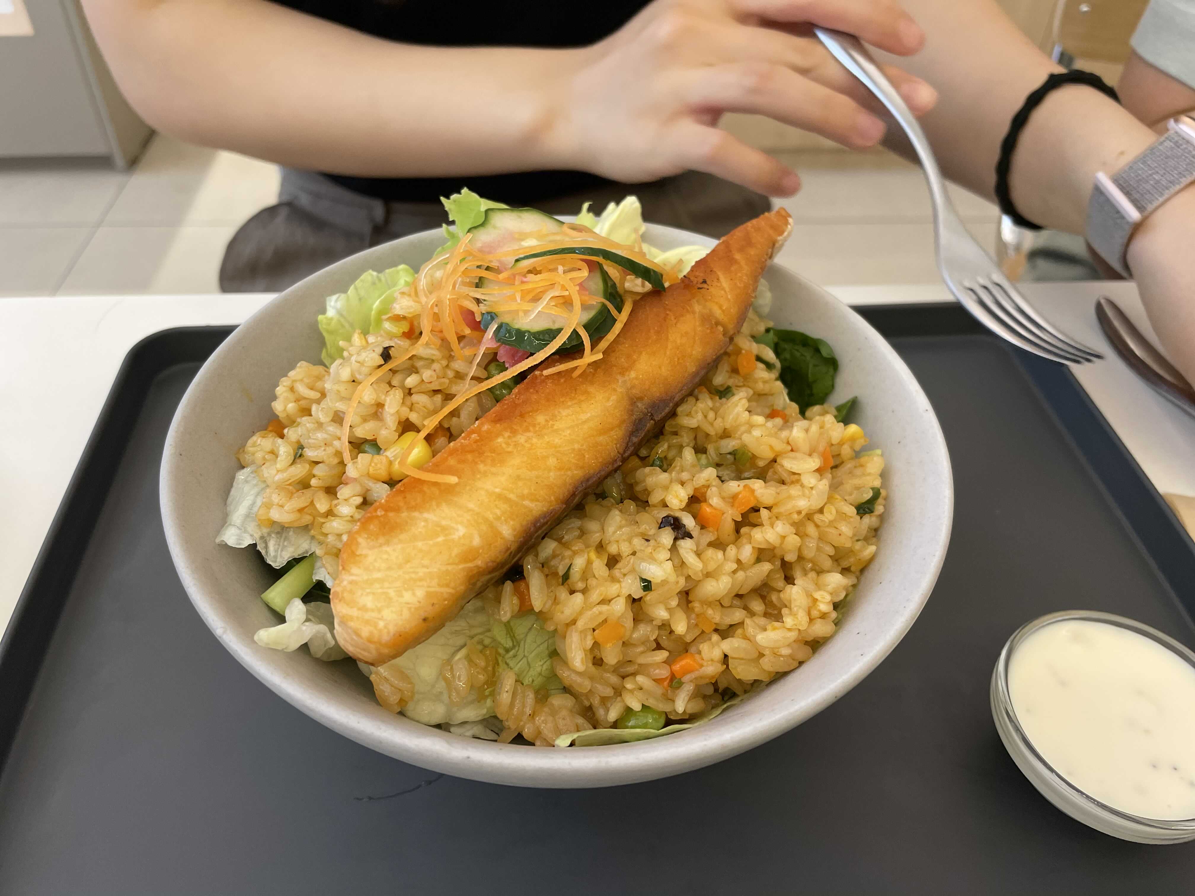 샐러드 본체 위에 볶음밥, 그리고 구운 연어를 올려줘요.