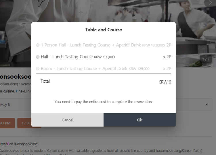 캐치테이블이라는 홈페이지를 통해서만 예약이 가능하고, 그날 식사할 메뉴의 금액을 미리 보증금으로 결제해야한다.