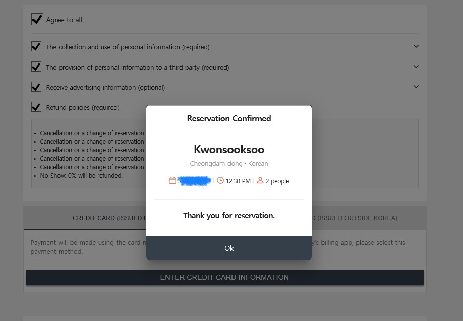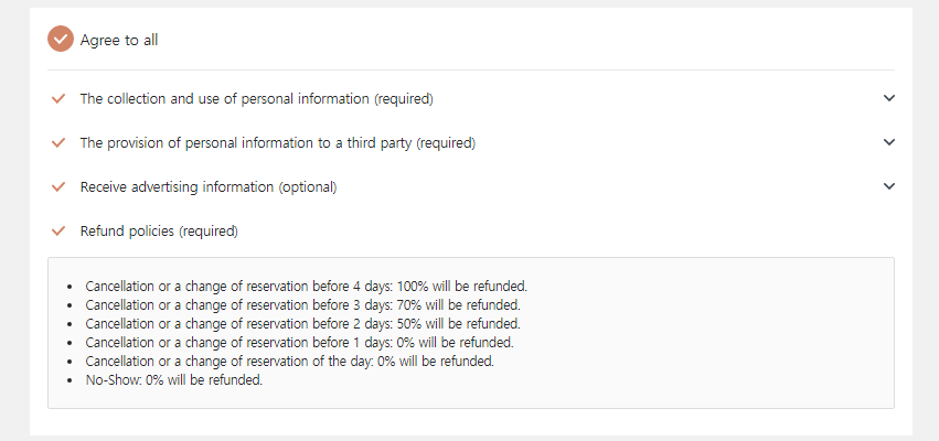 이러이러한 안내와 취소 규정 등등을 확인 한 뒤, 동의 agree to all 선택