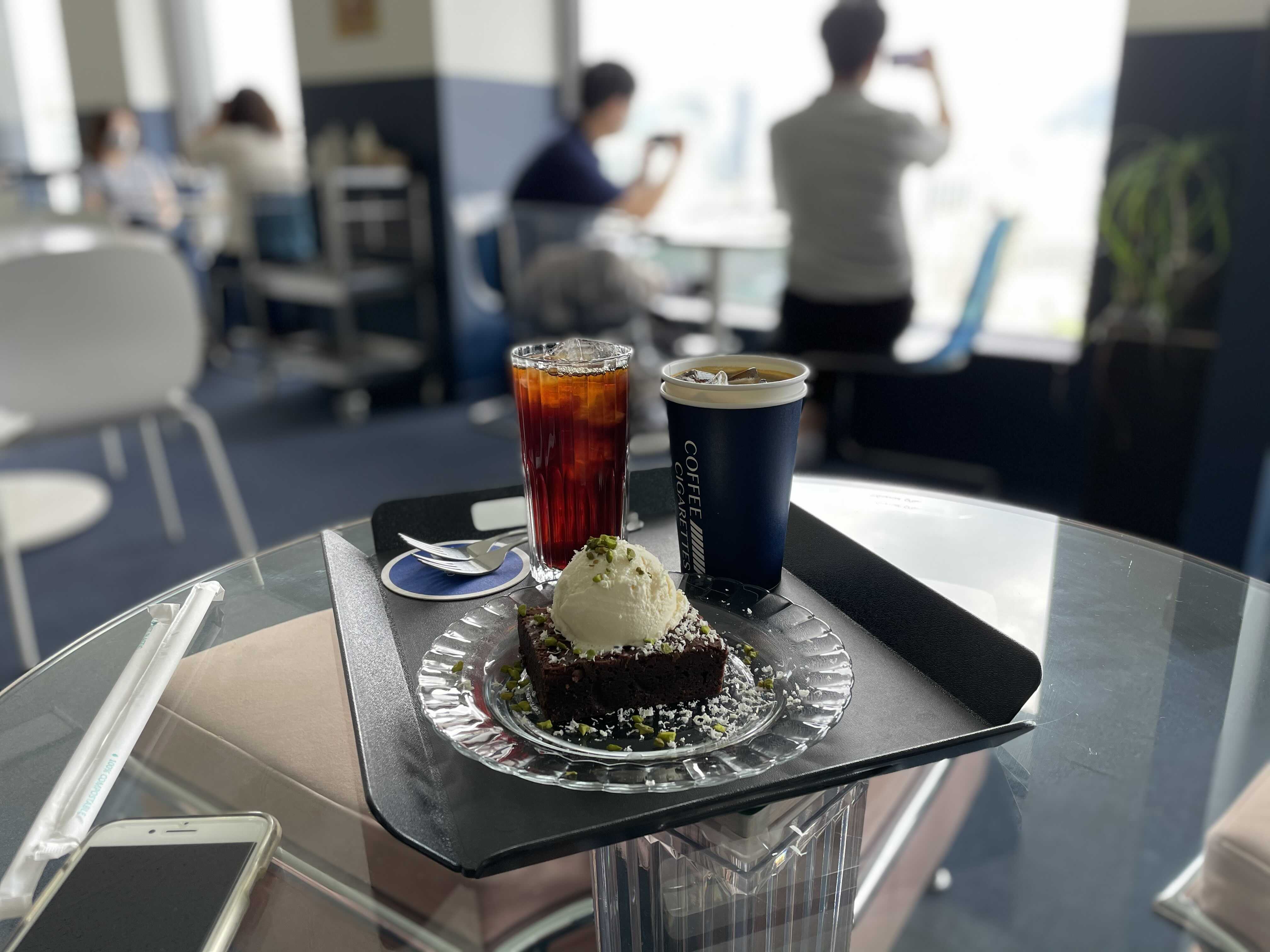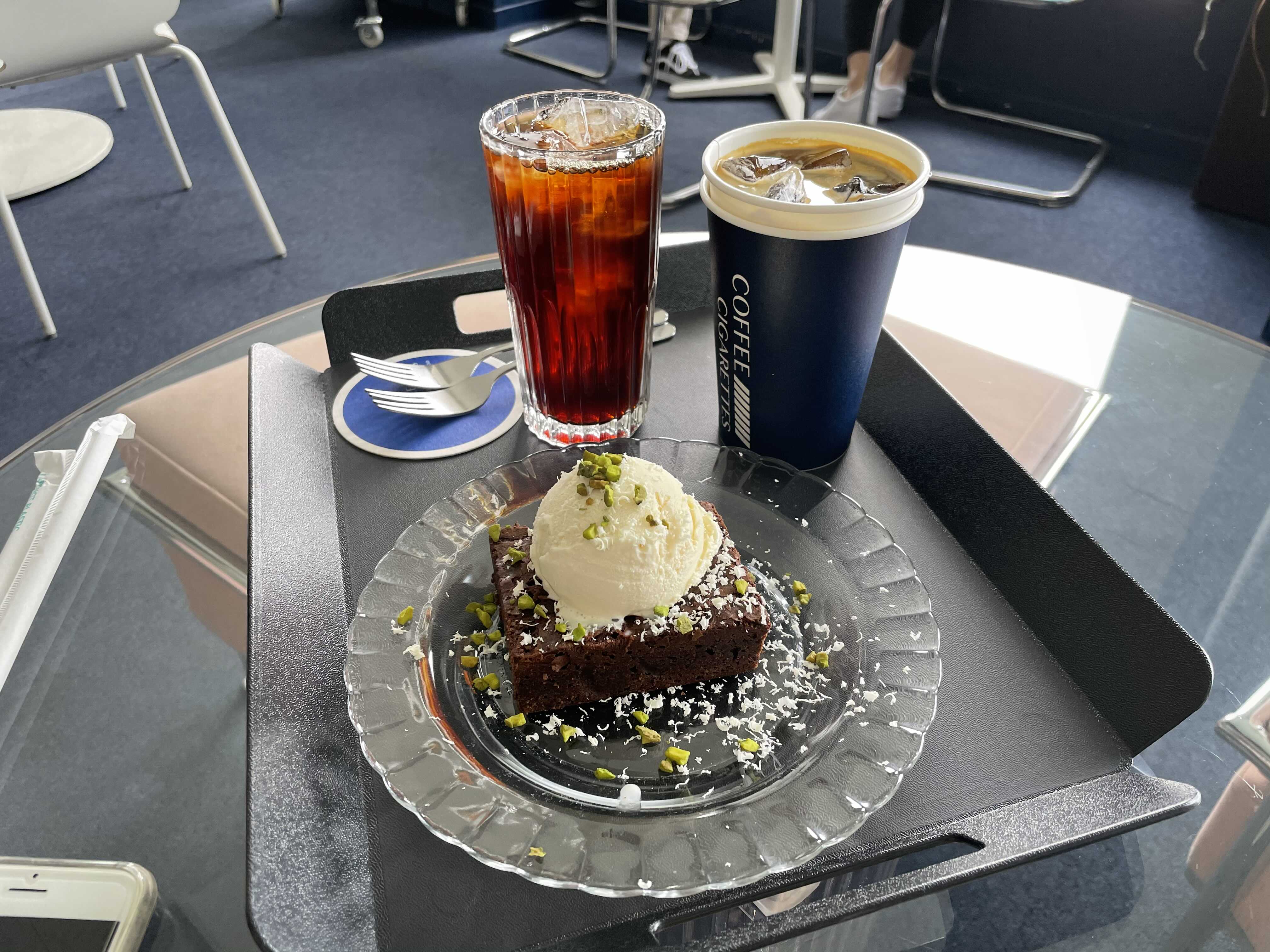 주문한 브라우니와 커피 두잔.