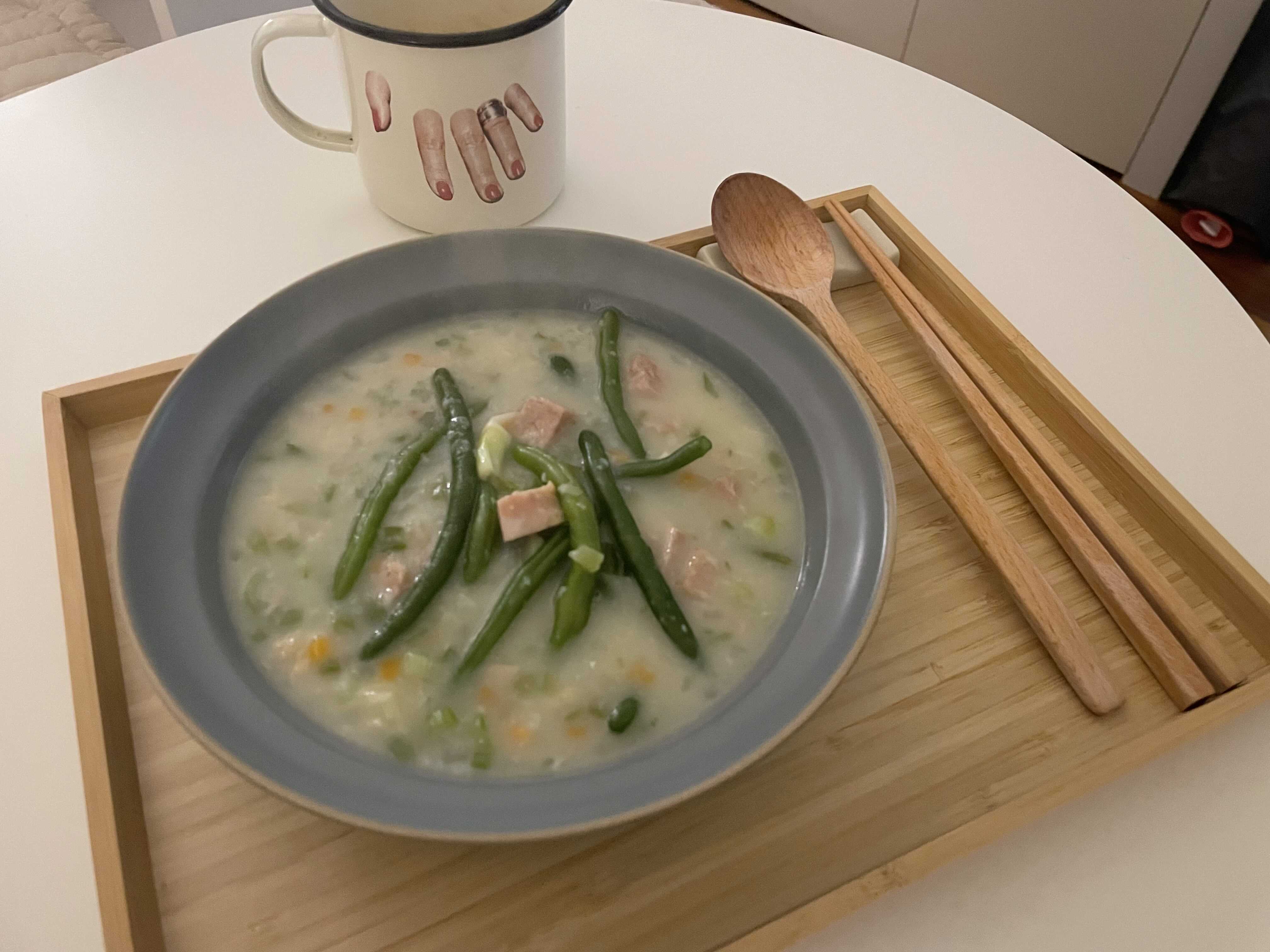 깍지콩, 야채 볶아서 갈은 밥 태국 죽 "쪽"을 넣어서 만든 야채죽