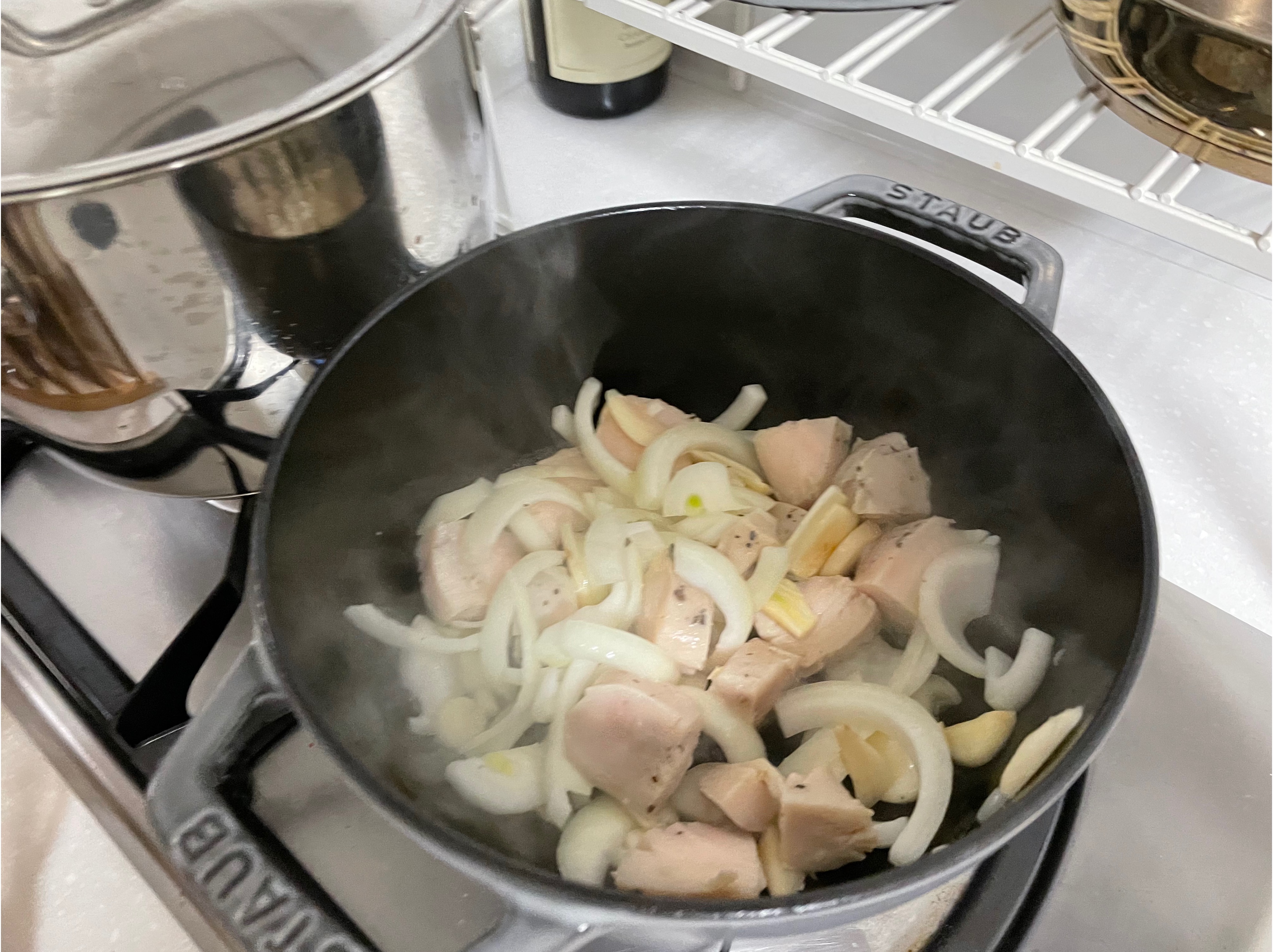 일단 야채와 마늘을 기름에 구워준다.