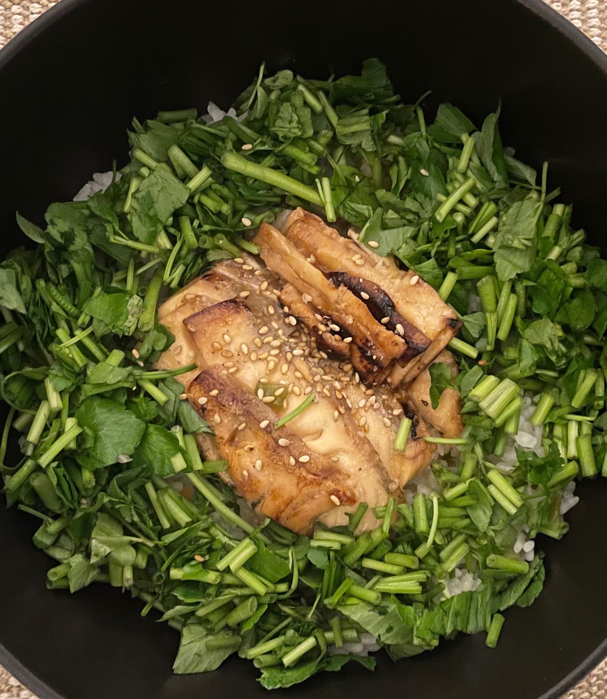 연어를 넣고, 그 주위로 미나리를 예쁘게 뿌려준 뒤,