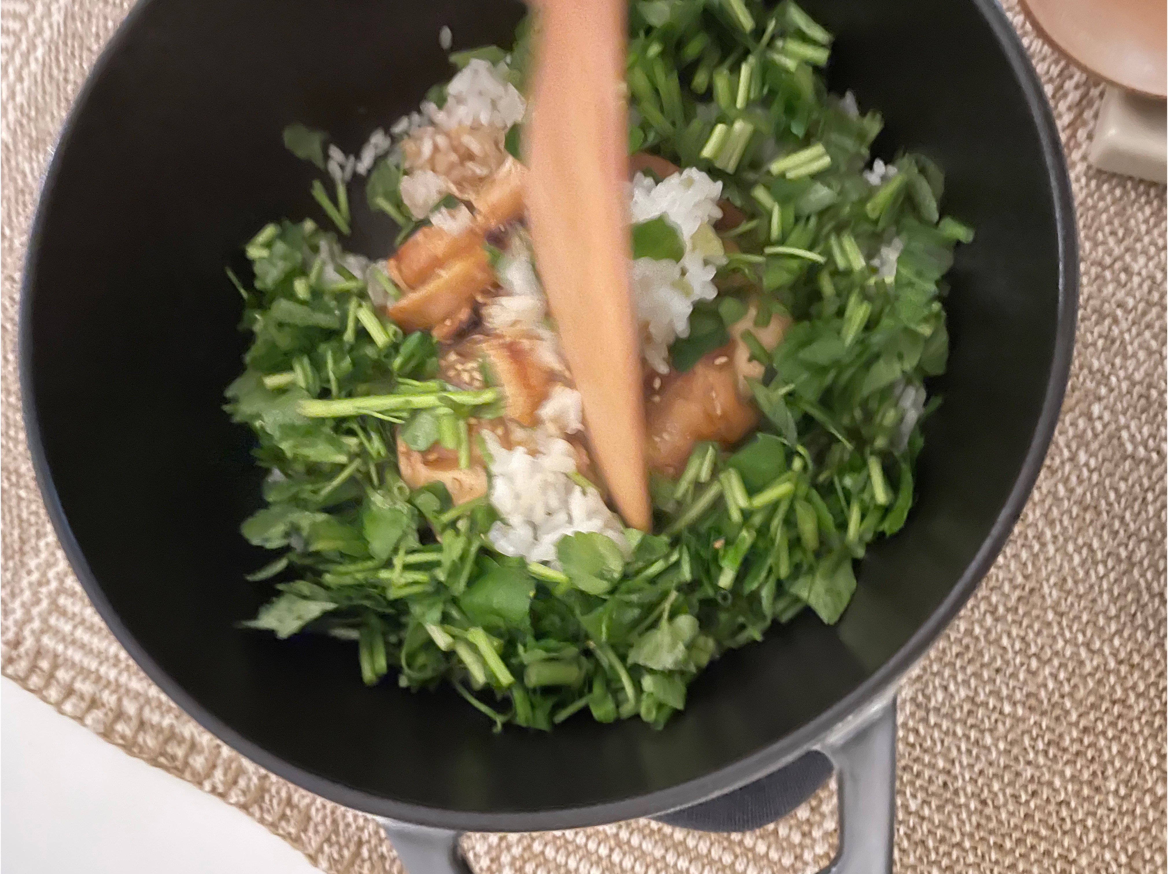 미리 구운 연어와 미나리를 넣고 5분간 뜸 들임!