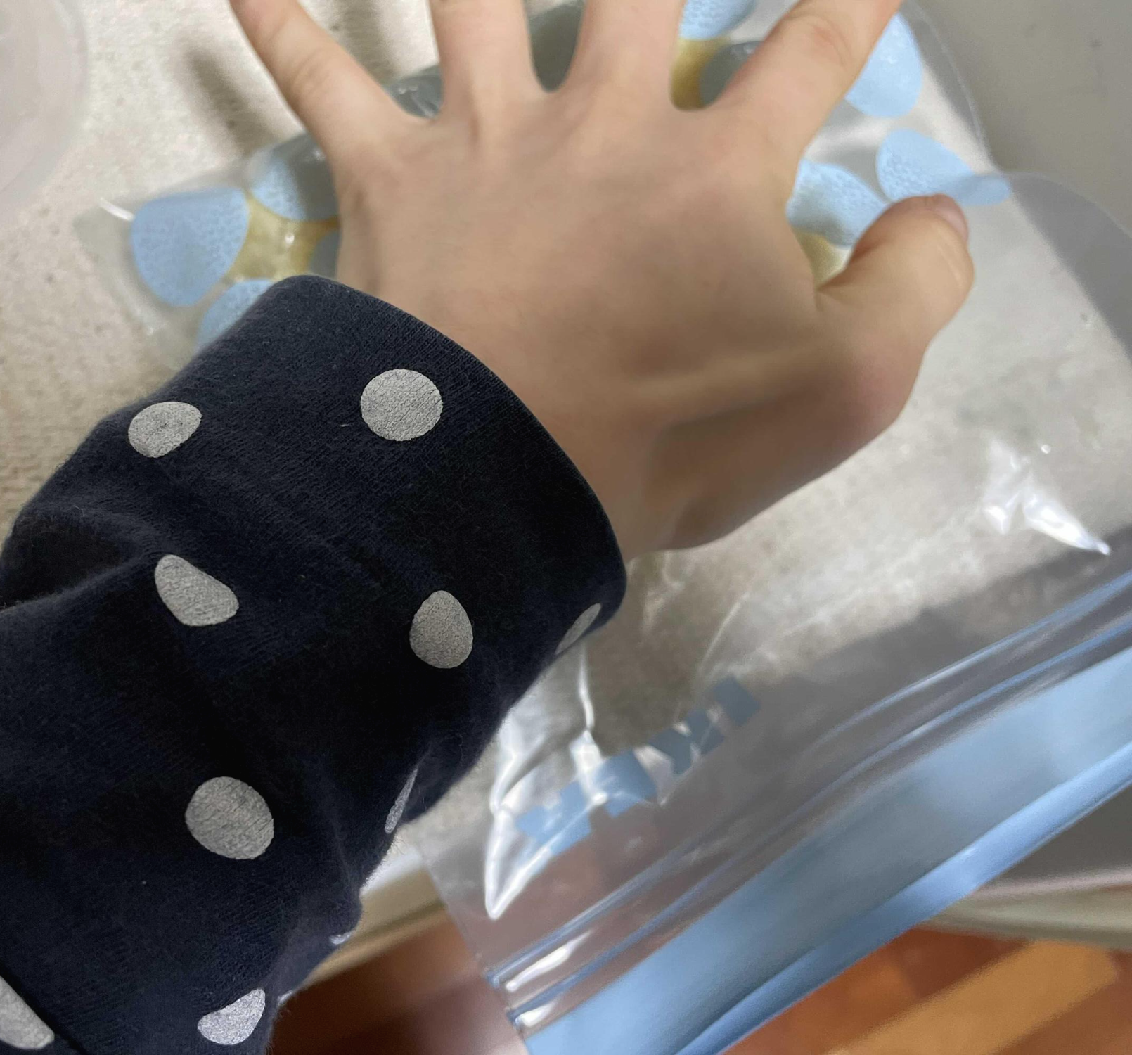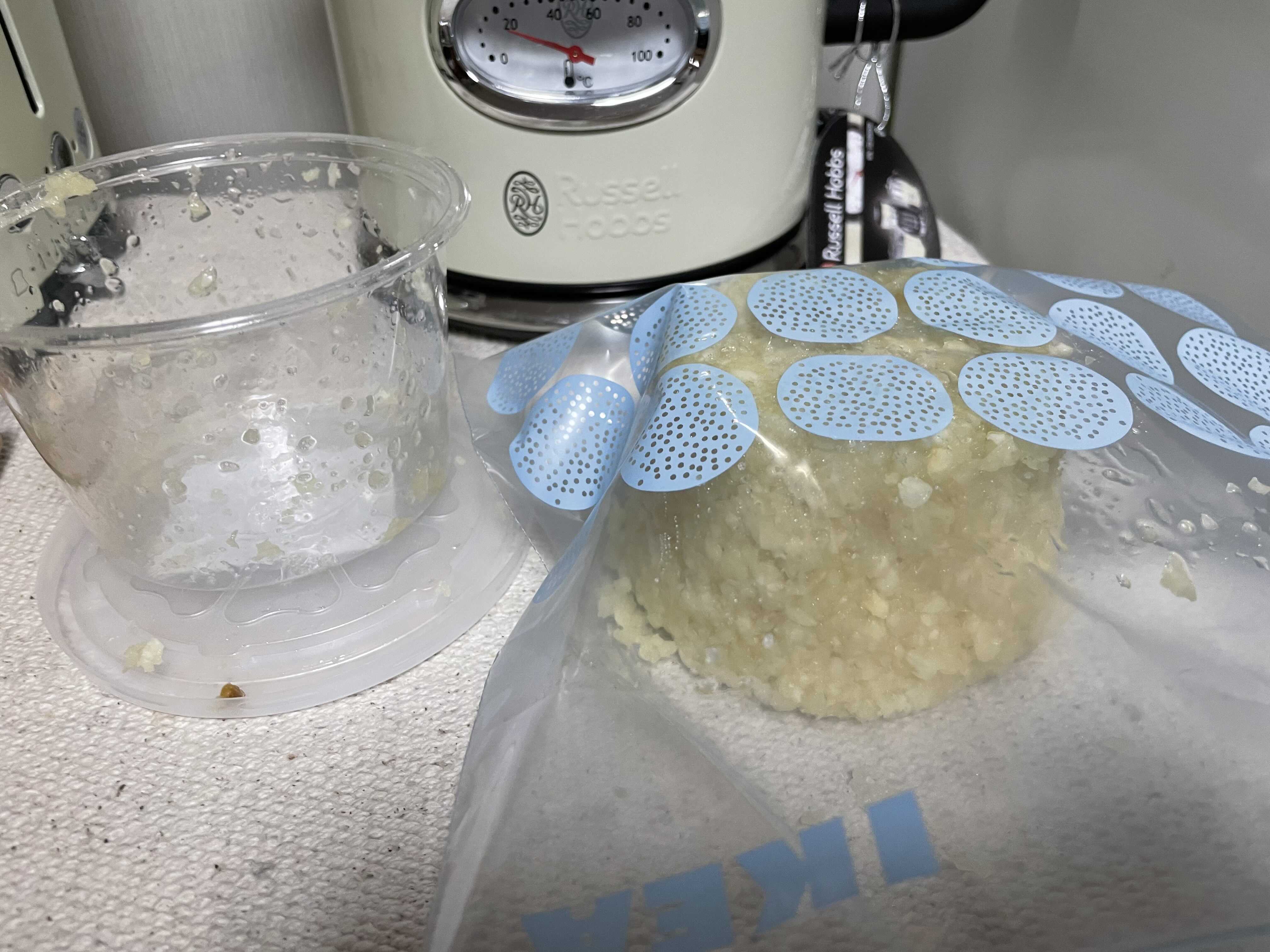 2. 봉지를 꾹 꾹 눌러서 얇게 펴준다. 다진마늘을