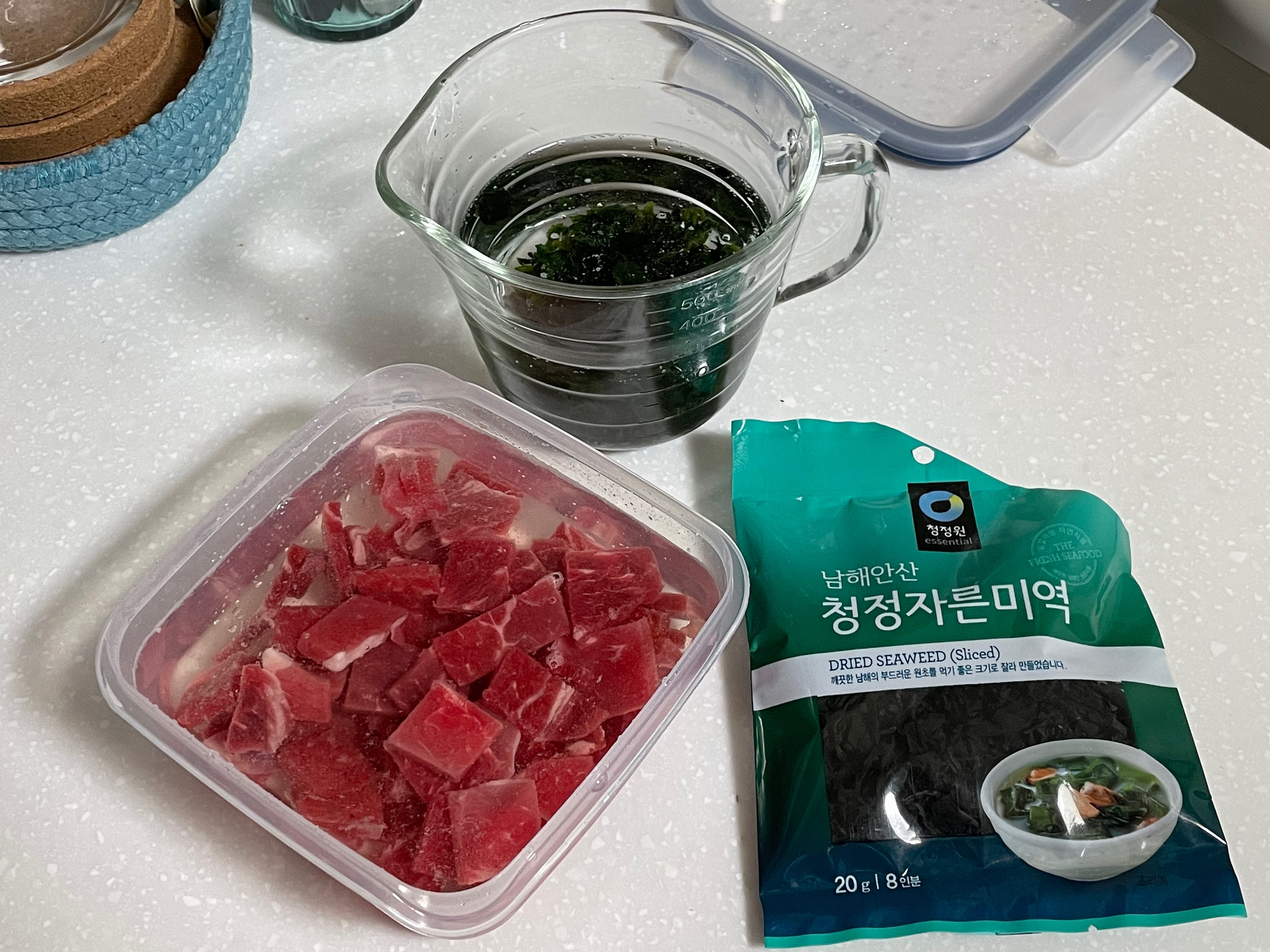 핏물을 뺀 고기와 미역은 물기를 잘 제거하고 준비 대기.