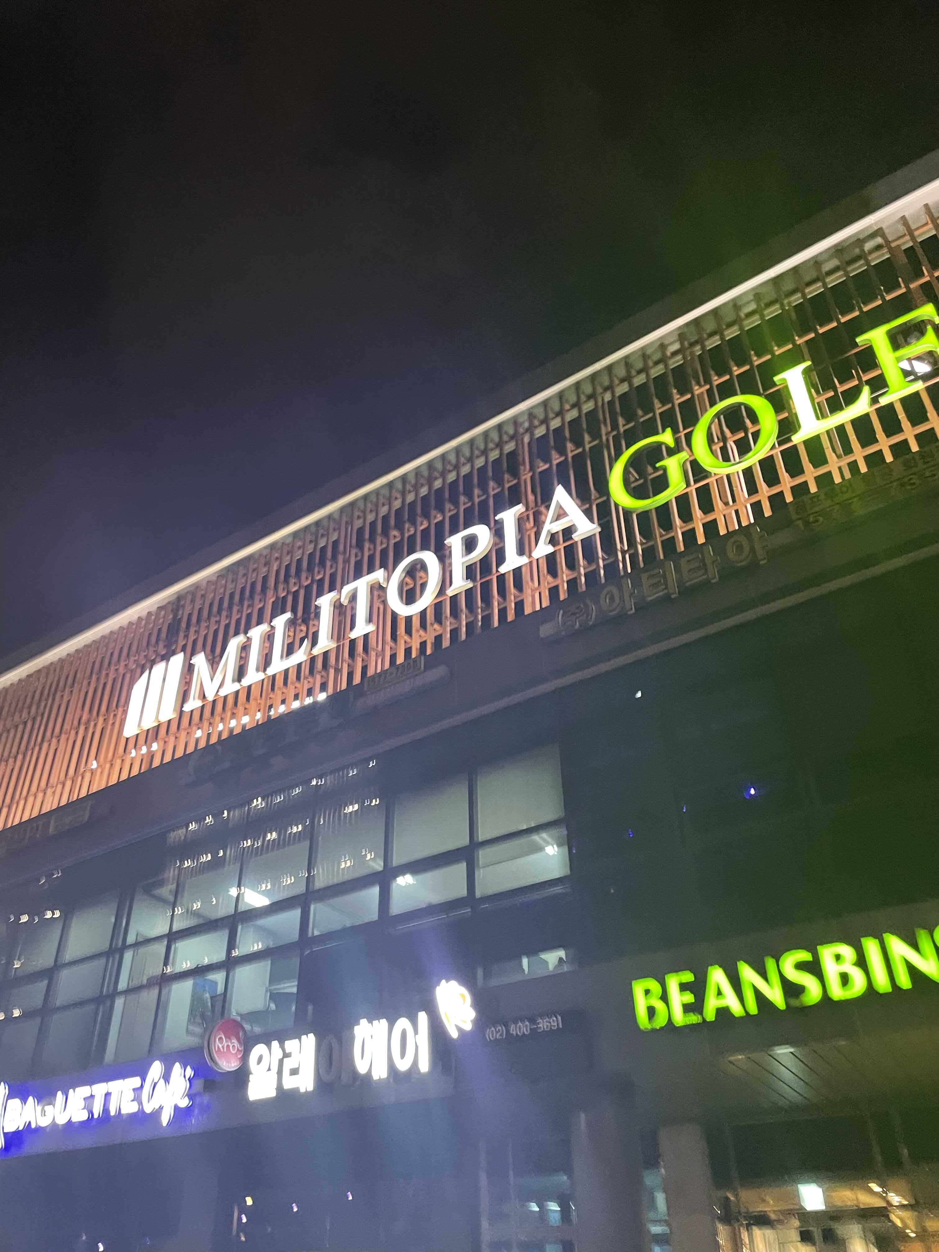 밤에 본 밀리토피아 건물.