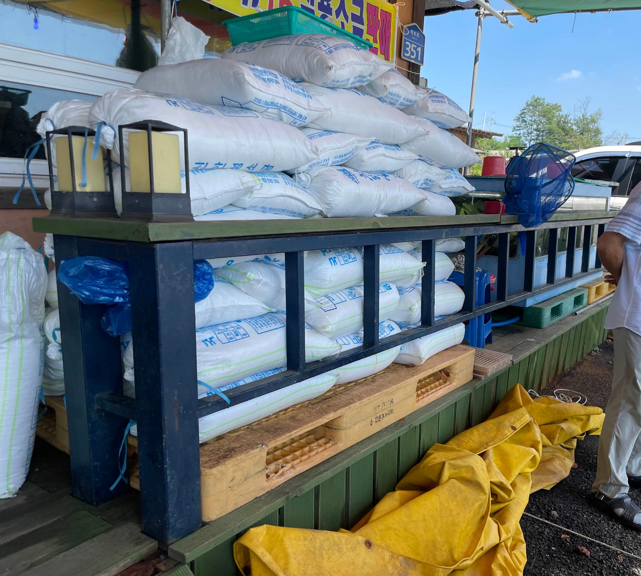 입구에 소금포대기가 이만치 쌓여있습니다.
