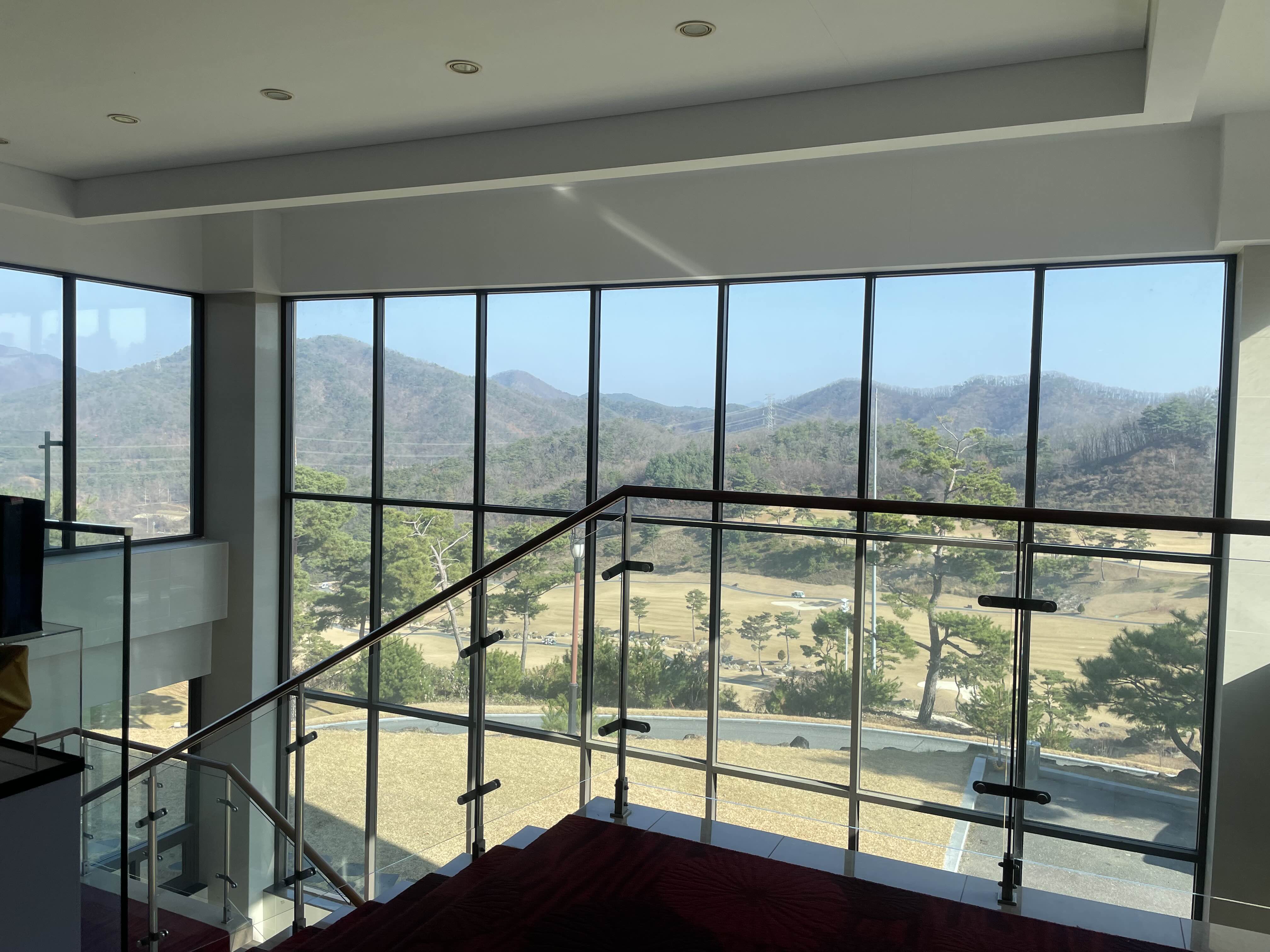 골프코스를 아래로 내려다보이는 창밖모습이다.