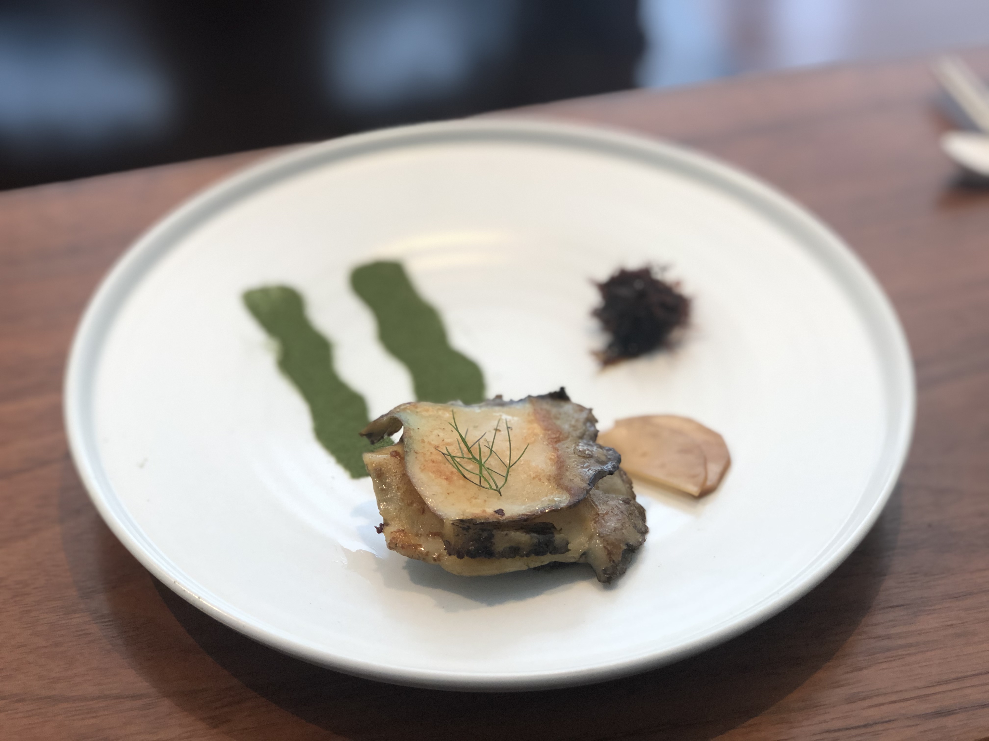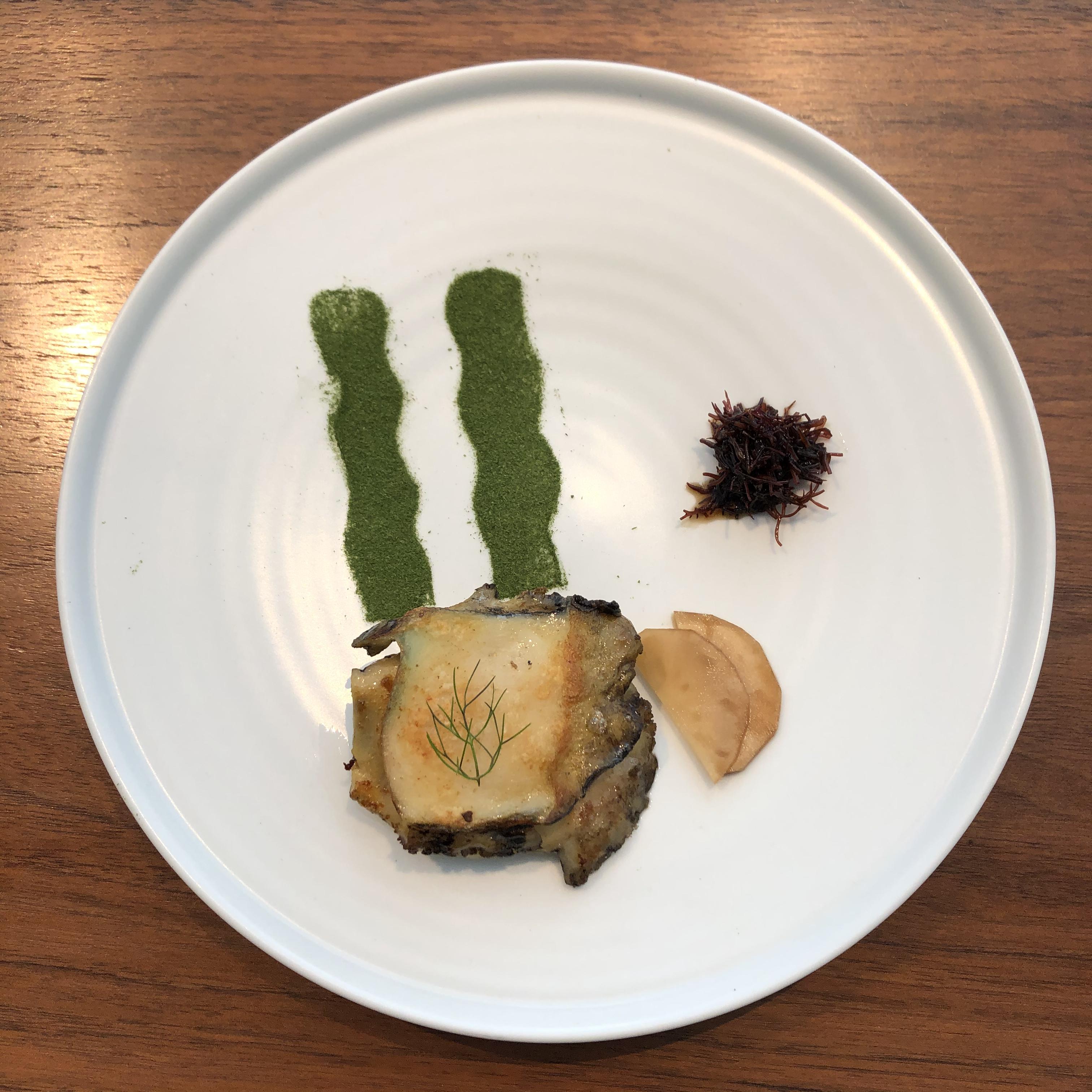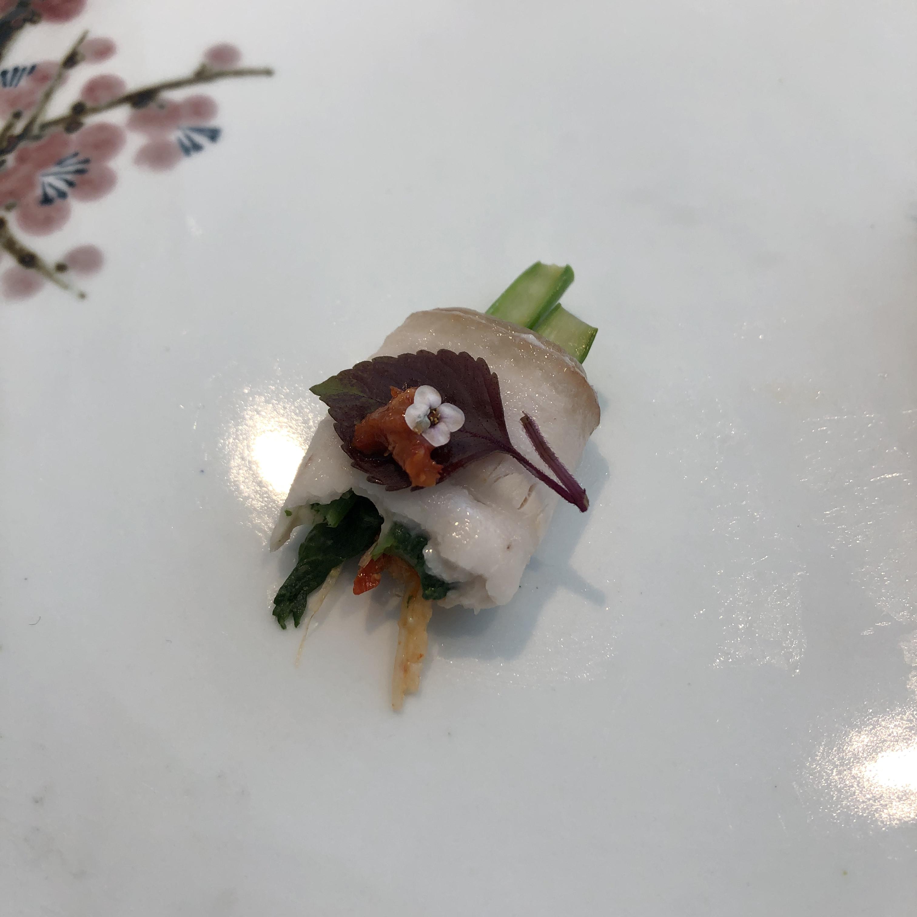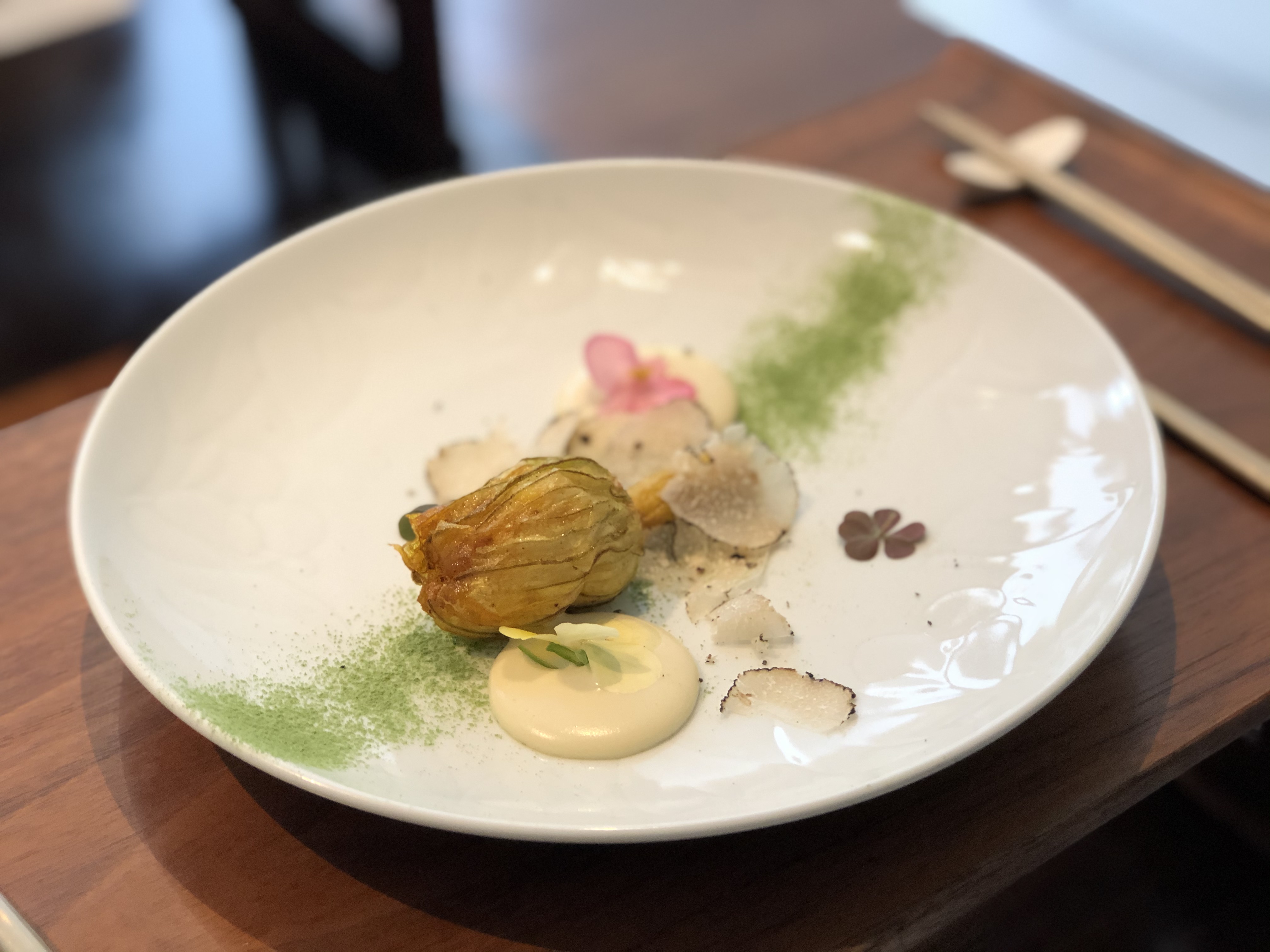 호박꽃 안에 탱글탱글 새우를 다져서 (잘게다지지는 않고 식감을 살려둠) 넣어 튀겨낸 요리였다! 케일가루가 뿌려져있어 같이 먹으니 조화로웠다!