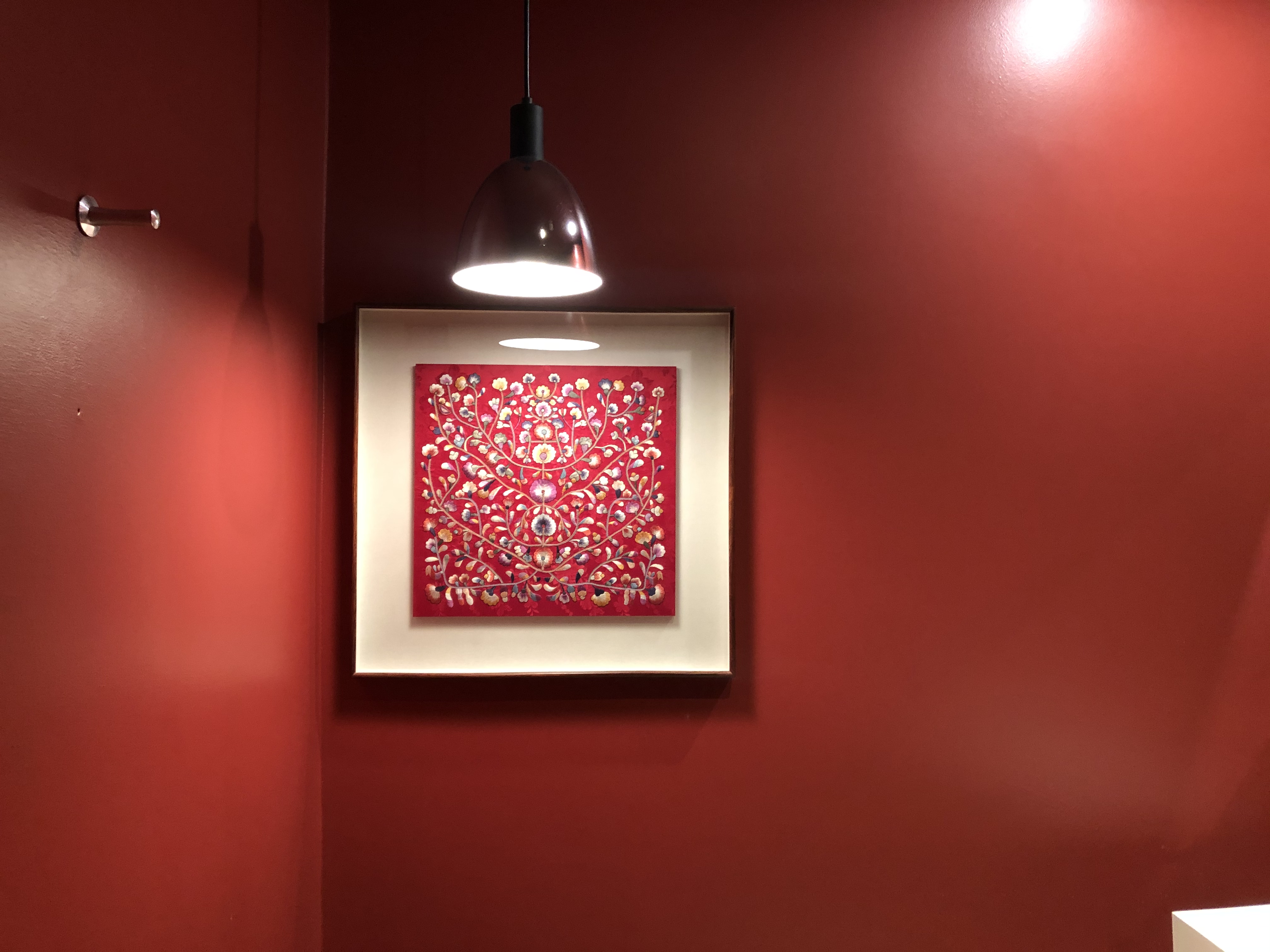 벽에는 규방공예 작품이 이쁘게 걸려있다. 붉은계열 벽지랑 매우매우 잘어울림!