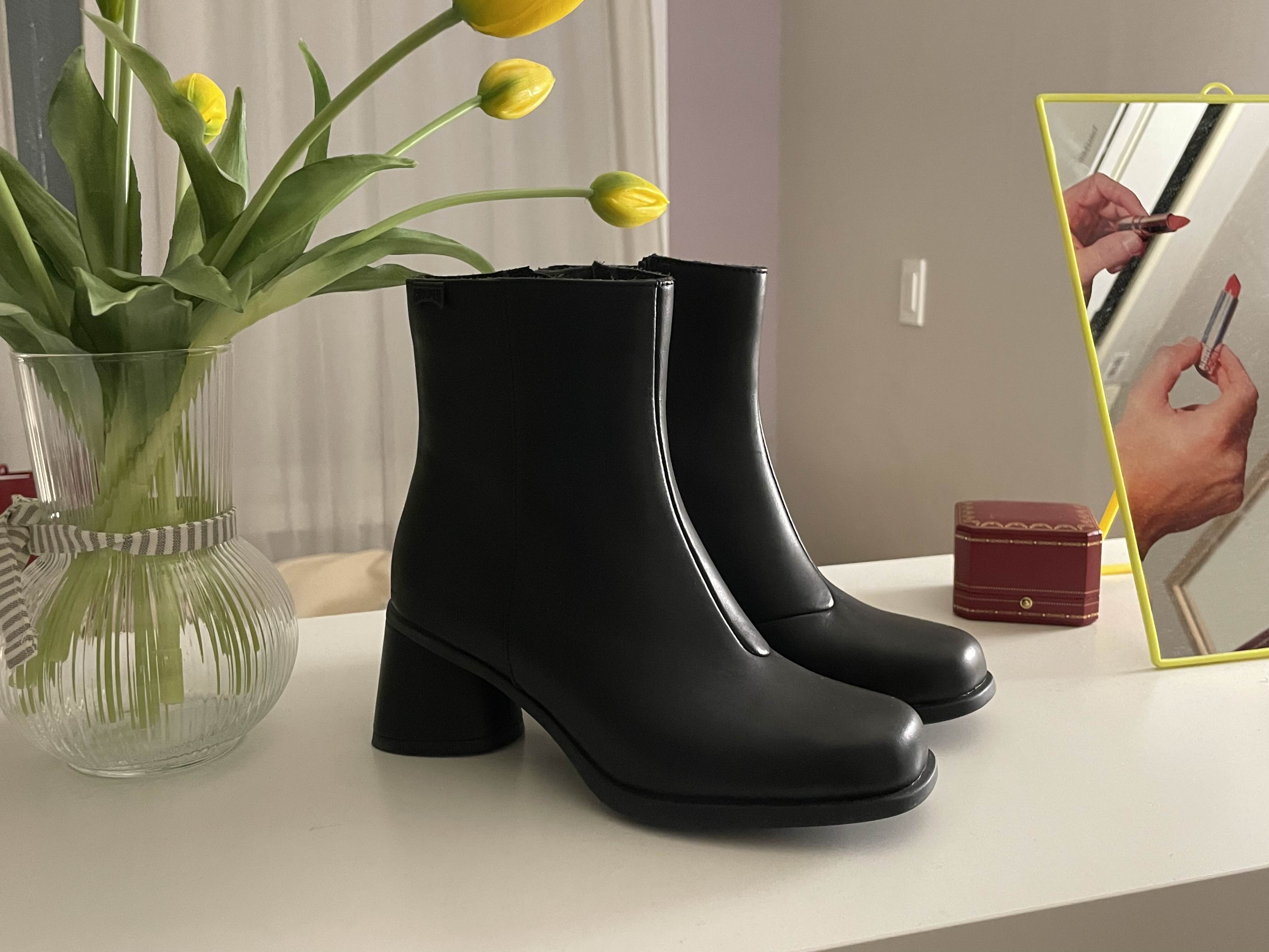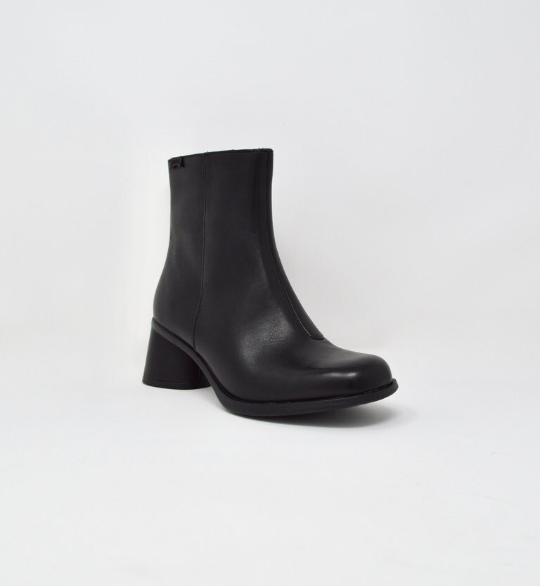 Black leather women's ankle boots with OrthoLite® Recycled™ footbeds and leather-lined rubber outsoles.<br/><br/>Bold silhouettes and colors characterize our Kiara.