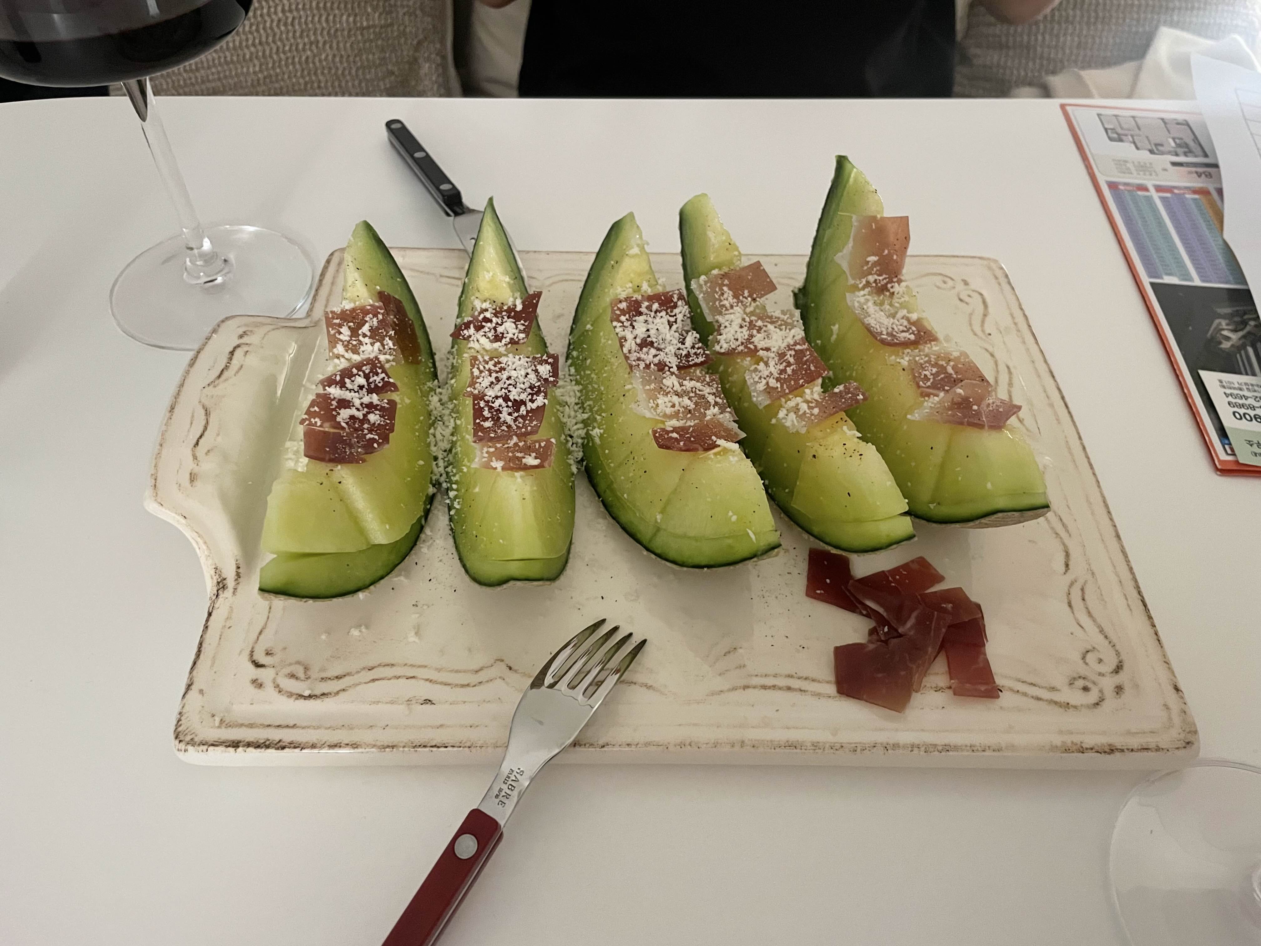 낮에 장 볼 때 사둔 메론 그리고 하몽.