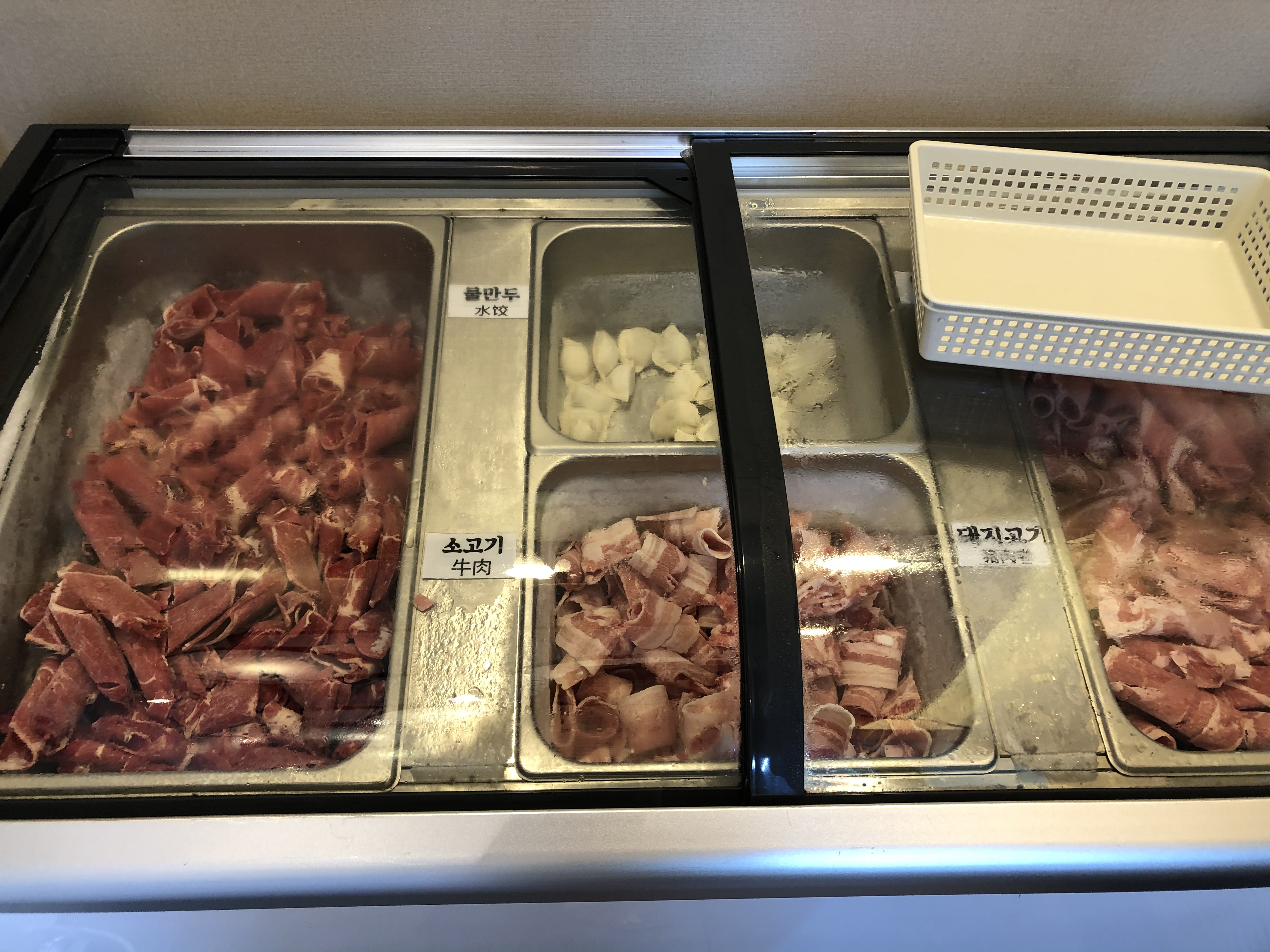 여느 무한리필집과 같이 소고기, 돼지고기(삼겹살), 양고기, 물만두로 구성되어있다.