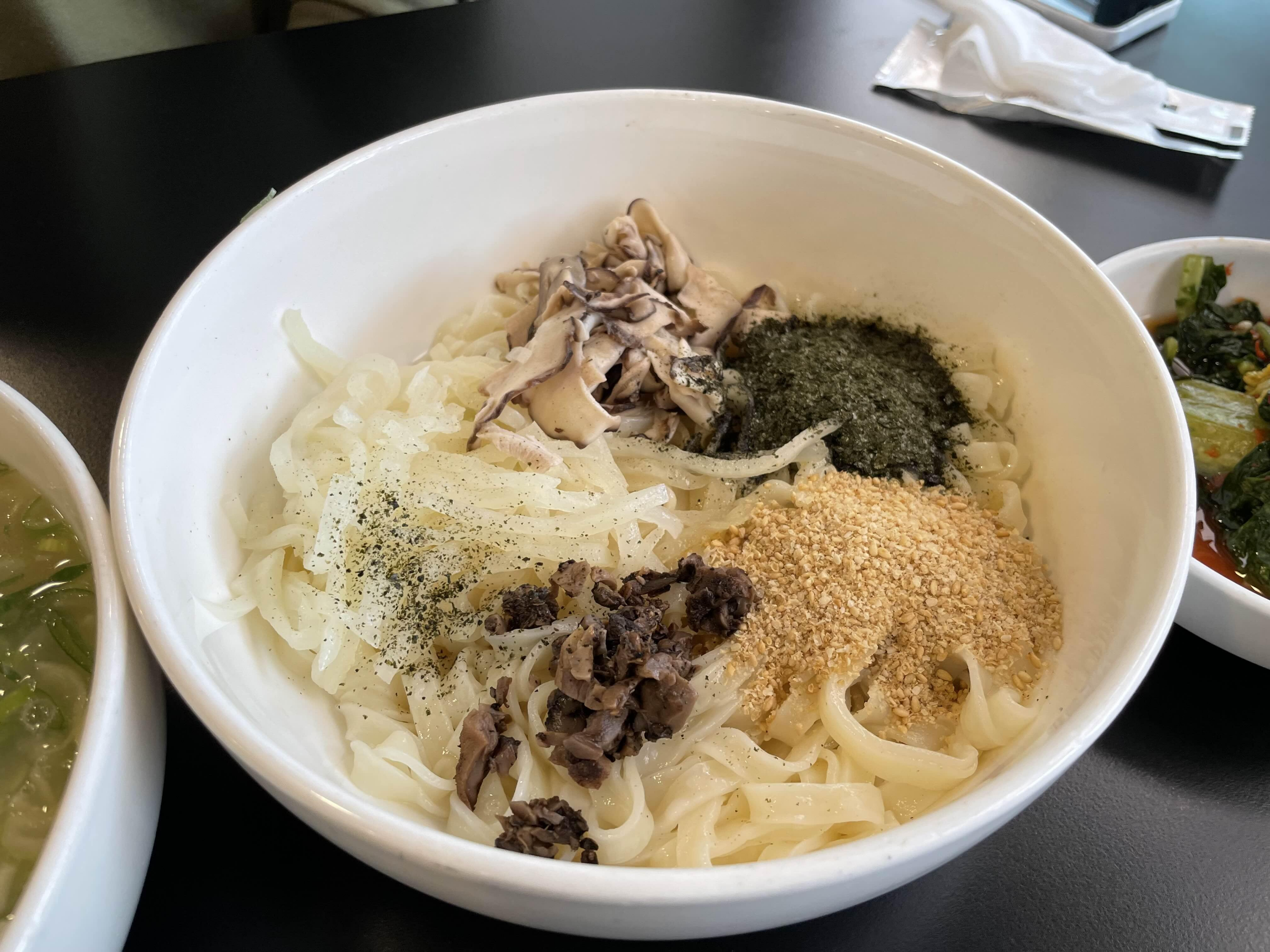 들깨와 김가루가 아주 곱고 표고와 각종 버섯 고명이 올려져있다.