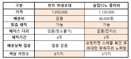 마네모네는 무조건 4주가 소요된다며 어렵다고 했고, 슬립디노는 바로 날짜 확인해주신 뒤 가능하다고 하셨음! 친절친절!