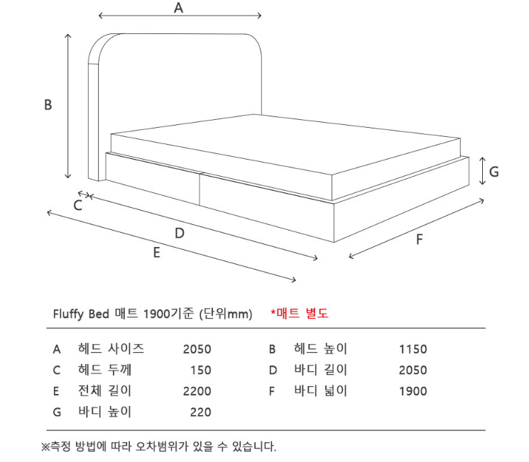 프레임 사이즈 - 1900*2100*1050 (헤드높이) / 베이스높이 200 / 헤드보드 너비 2050