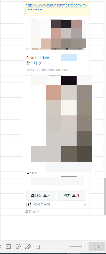 쳇팅창의 윗 부분이 바른손모바일청첩장이고, 아랫 부분이 메이크디어 모바일청첩장이다.