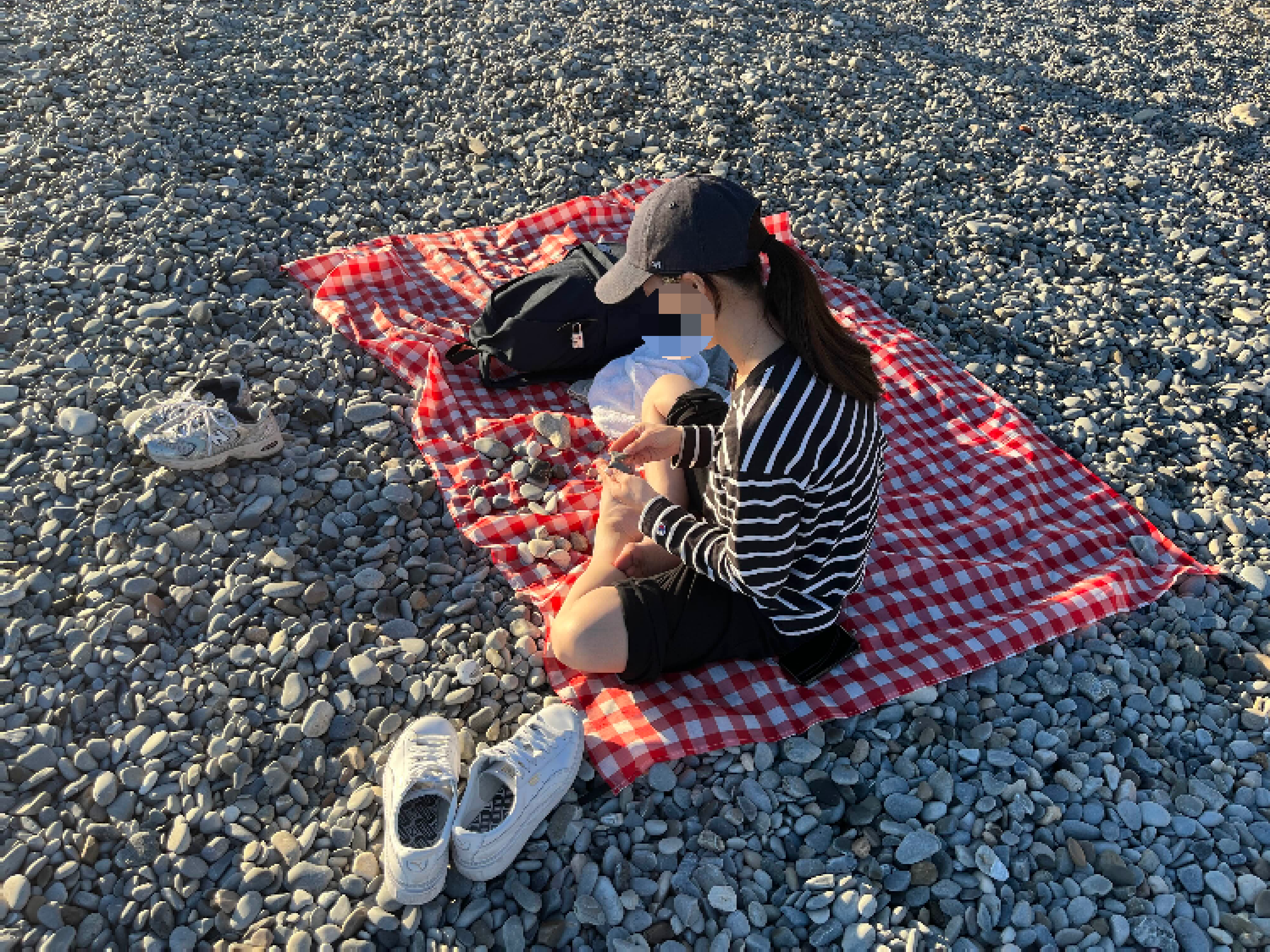 멀리 있는 오빠 지켜보면서 이쁜 자갈도 찾아보고