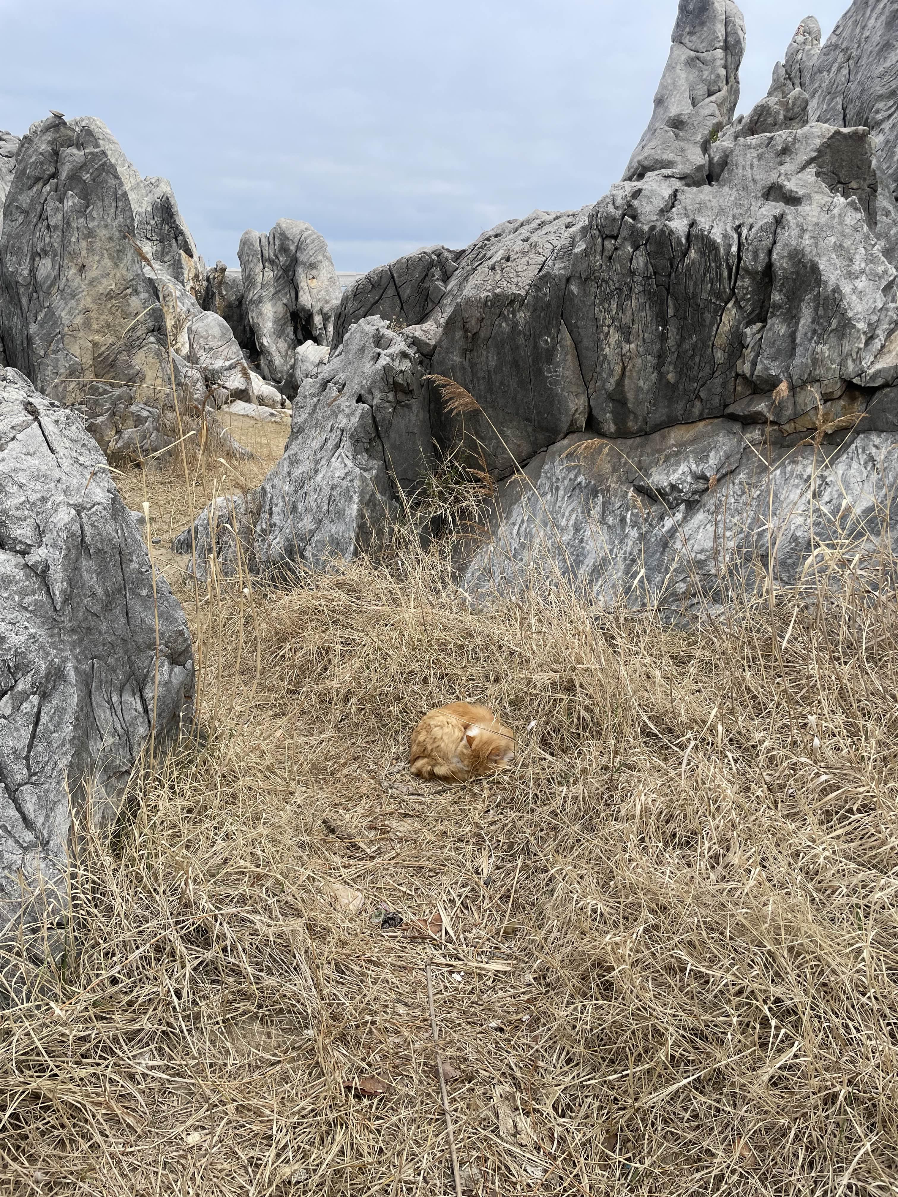 멋진 바위 틈 사이로 무언가 꼼지락 거려서 보니, 털복숭이 고양이가..