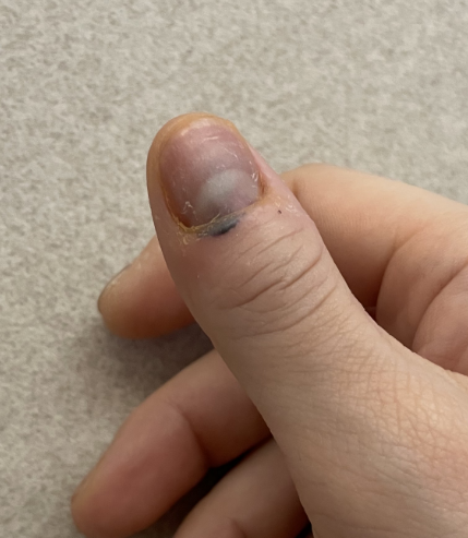 손톱 중앙에 하얗게 손톱이 변한 부분이 있다.