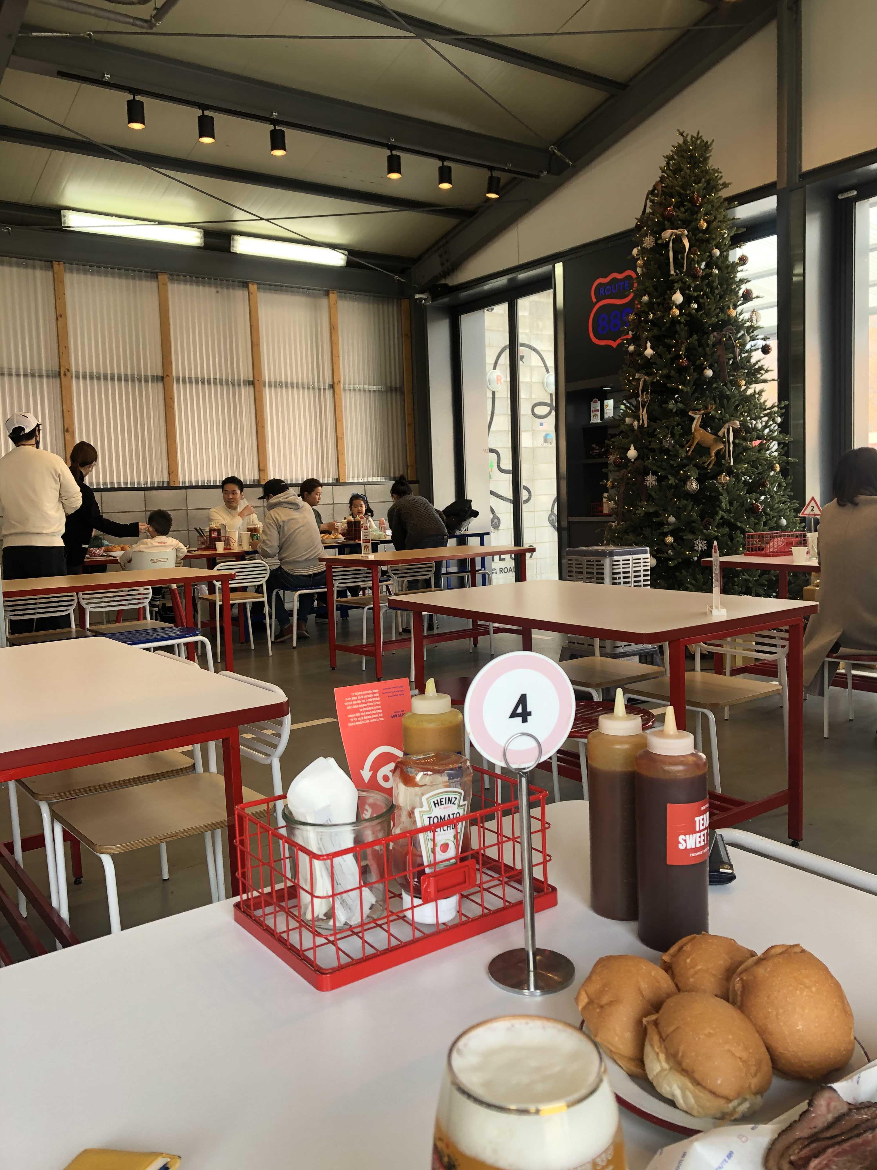 입장하면서 큐알코드 체크인하면 바로 나오는 홀 전경이에요! 마치 창고처럼 층고가 높고, 미국 패스트푸드점 처럼 원색의 테이블 셋팅으로 미국미국한 느낌이 물씬이었답니다. 점원들도 빨간 유니폼을 갖춰입고 재미나 보였어요. 곧 있으면 크리스마스이니, 커다란 트릴도 장식해두었는데 천장이 높아서 시원시원하고 답답한 느낌없이 좋았답니다.