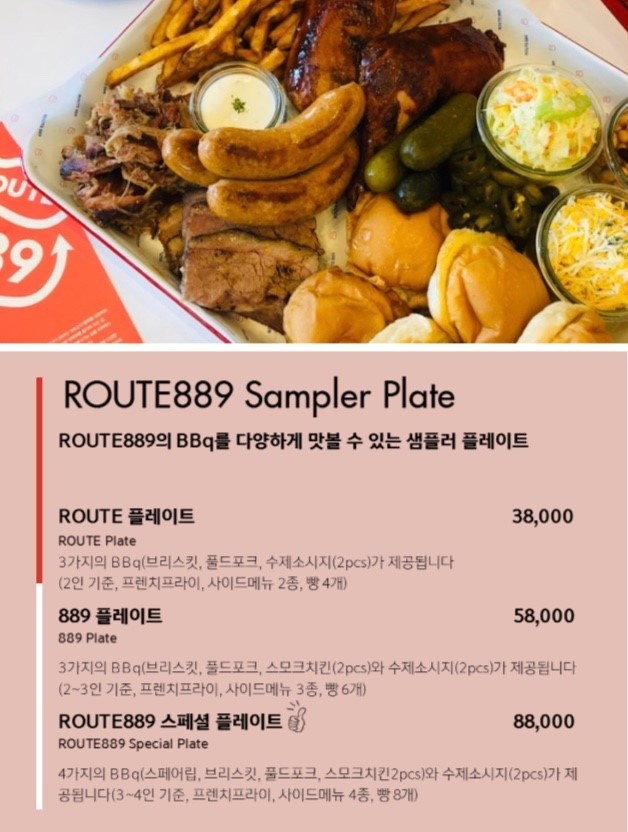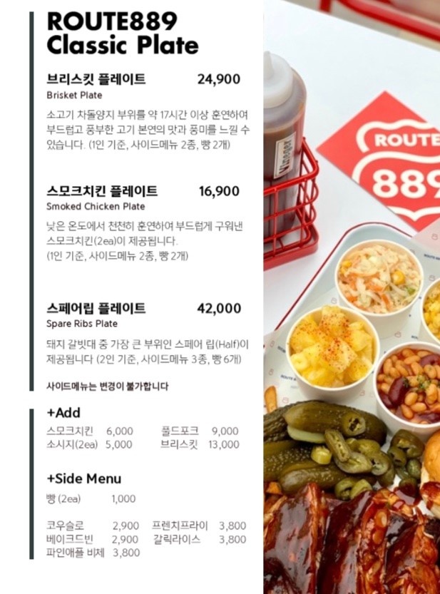 주된 메뉴의 사진을 가져와봤어요. 미국식바베큐를 전문으로 하다보니, 브리스킷, 폴드포크, 소시지, 스모크치킨 등이 주된 메뉴로 구성되있었요. 스모크치킨 플레이트가 인기가 많았는지, 저희가 갔을 때엔 이미 솔드아웃이었답니다. 위 매뉴 외에 다른 메뉴들도 많았지만 사이드였고, 주로 요페이지에서 많이 시키더라구요!