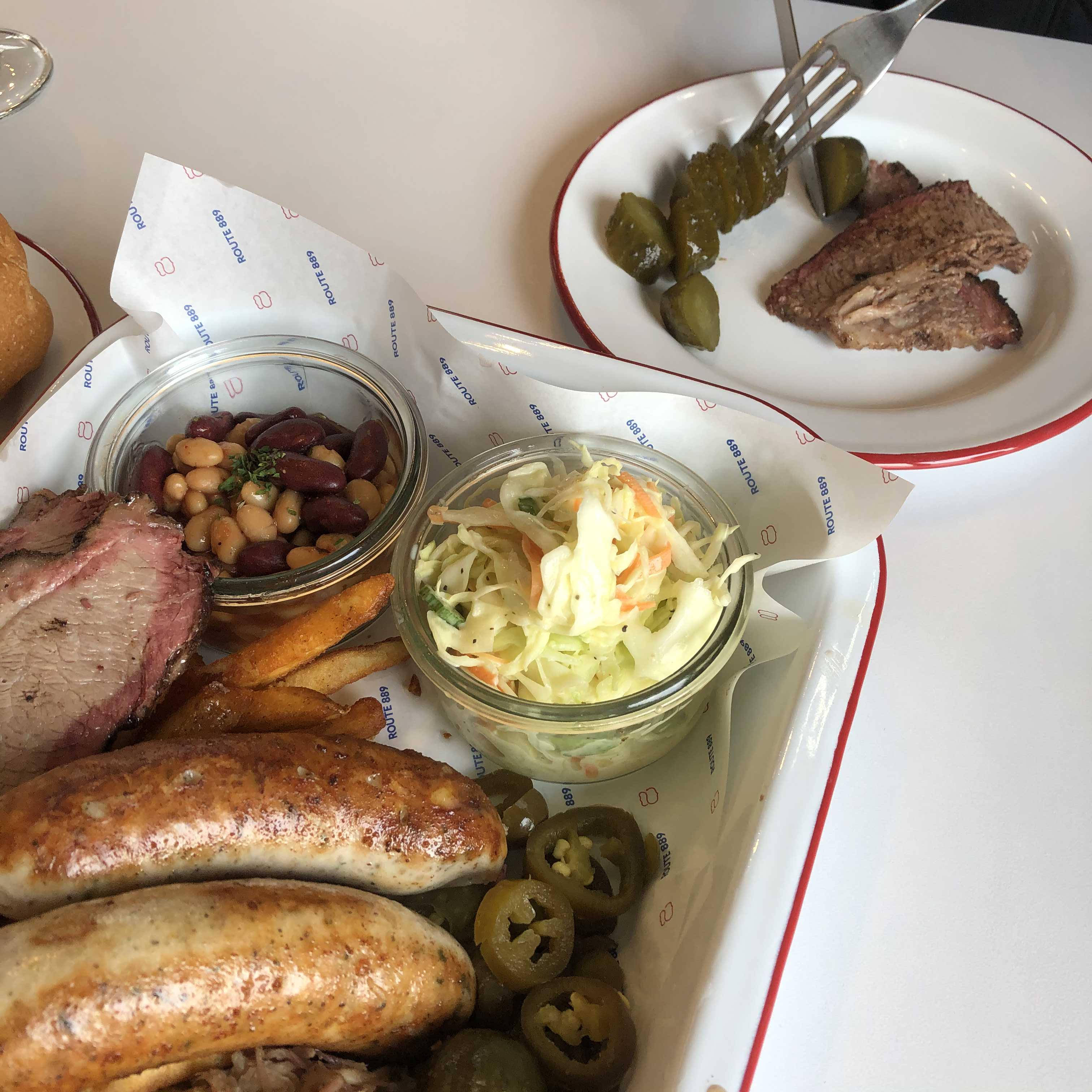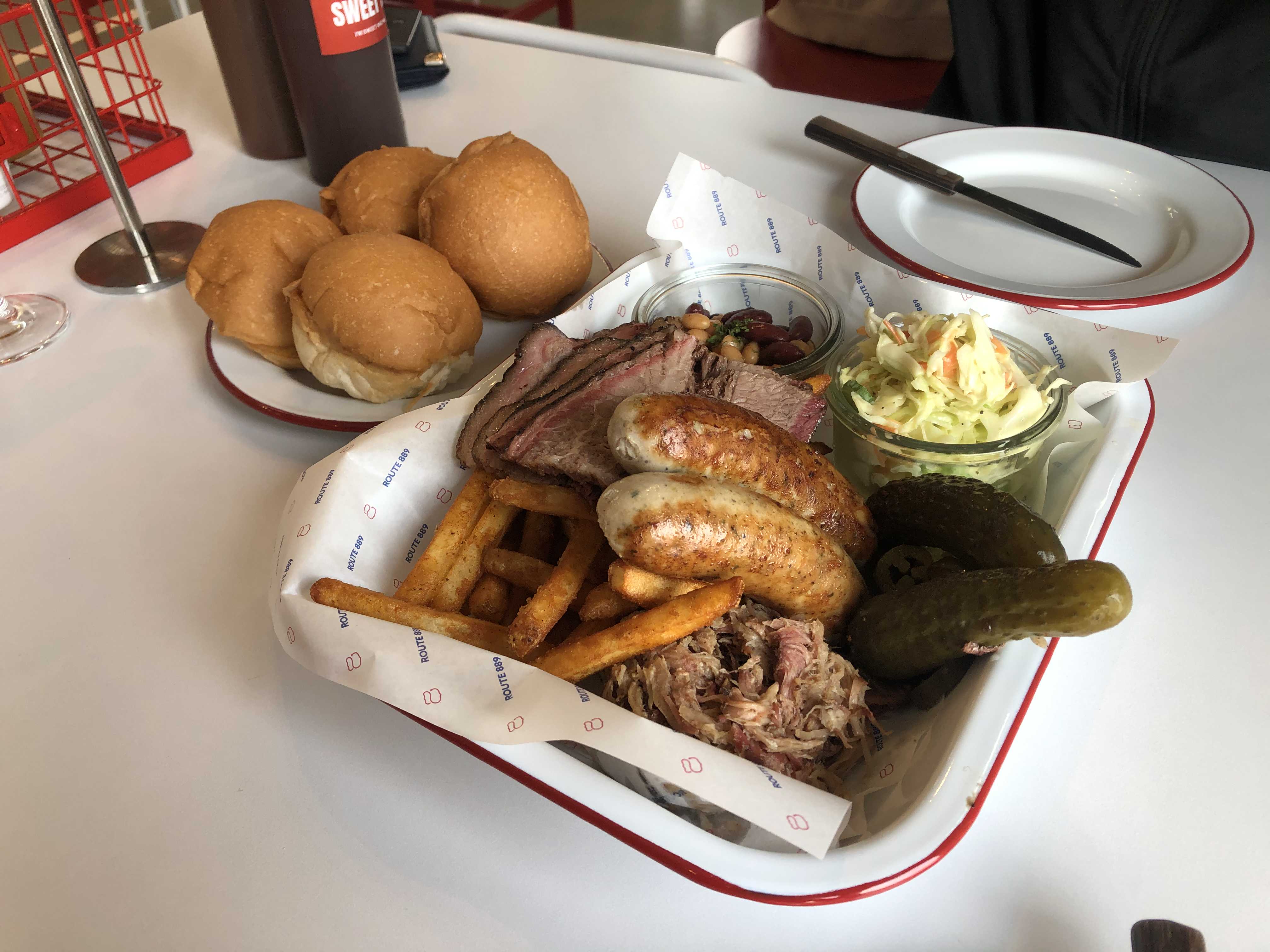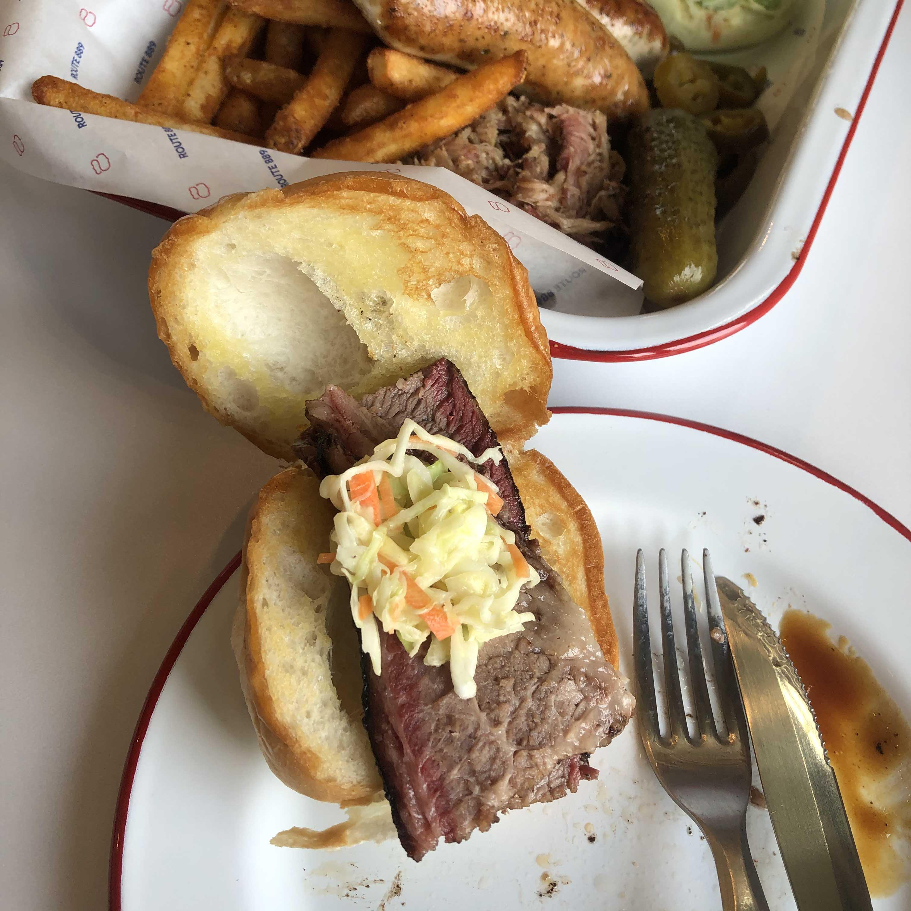 루트플레이트는 브리스킷, 폴드포크, 소세지 구성으로 되어있는 메뉴이고 코울슬로, 통조림콩(?), 피클, 프렌치프라이가 사이드로 함께 나왔어요. 그리고 함께 먹을 빵도 4피스씩 같이 주더라구요. 생각보다 양이 많아서 좋았습니다!